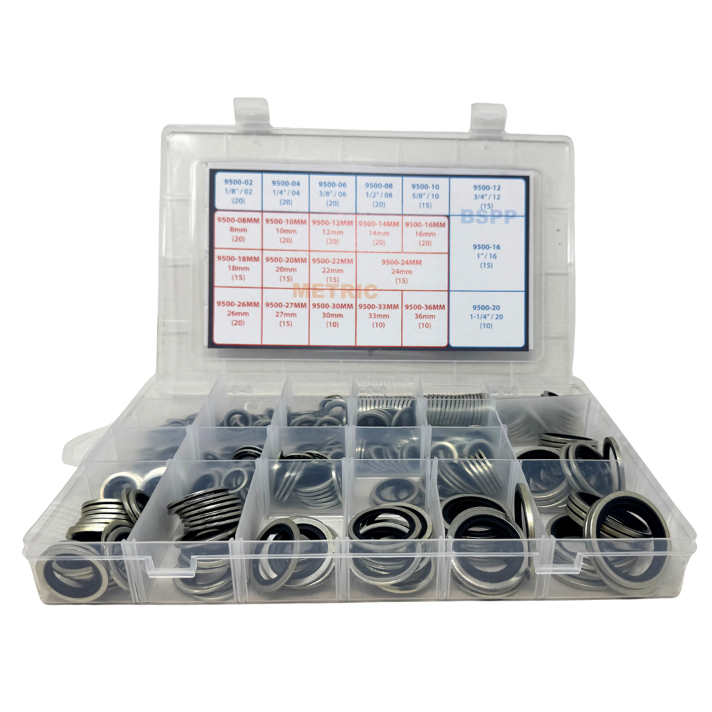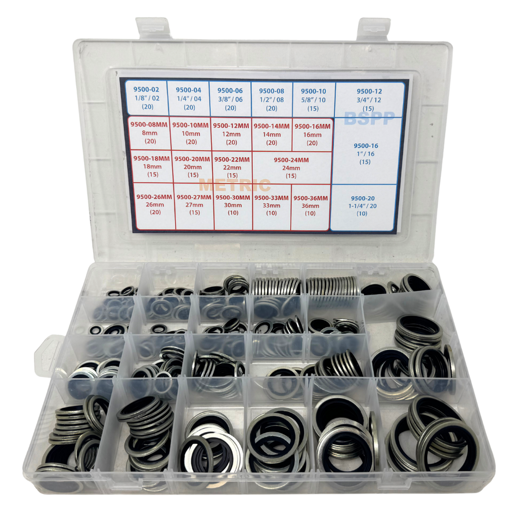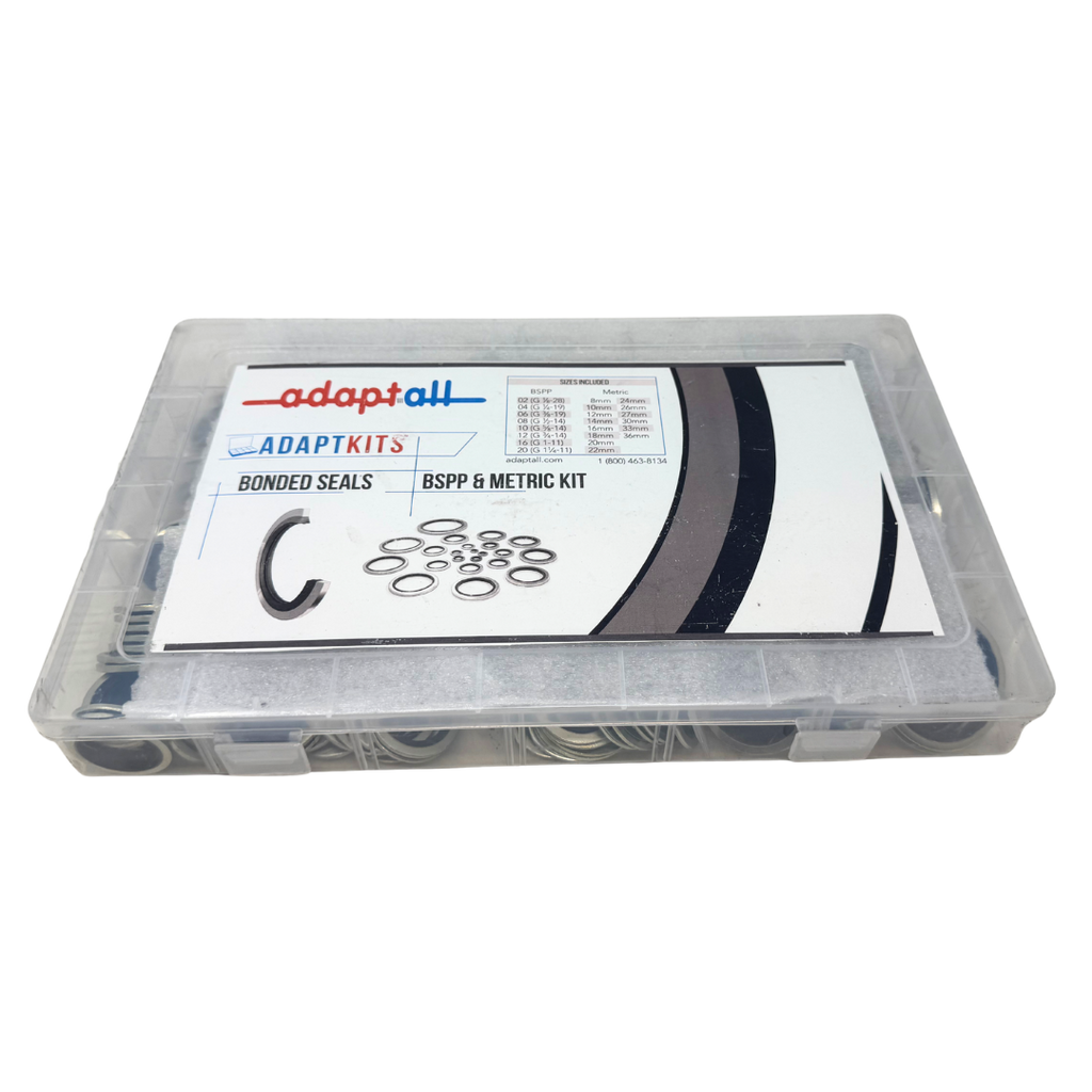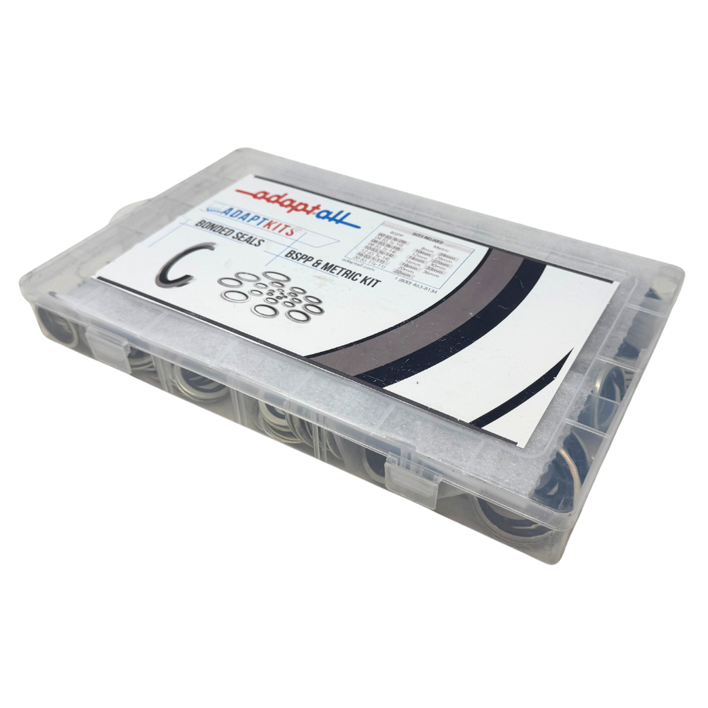 Our OneHydraulics Adaptall BSPP & Metric Bonded Seal Kit is a complete assortment of the most commonly used bonded washers designed to create secure, leak-free connections in hydraulic systems. This professional-grade kit includes both BSPP and Metric sizes, providing everything you need for sealing flat-faced fittings and preventing fluid leaks under high pressure. Each bonded seal features a durable metal washer with a rubber insert to ensure a tight, reliable seal between components. Lightweight, organized, and portable, this kit is perfect for keeping in your shop or service truck, giving you quick access to the right bonded seal for any hydraulic repair or installation.