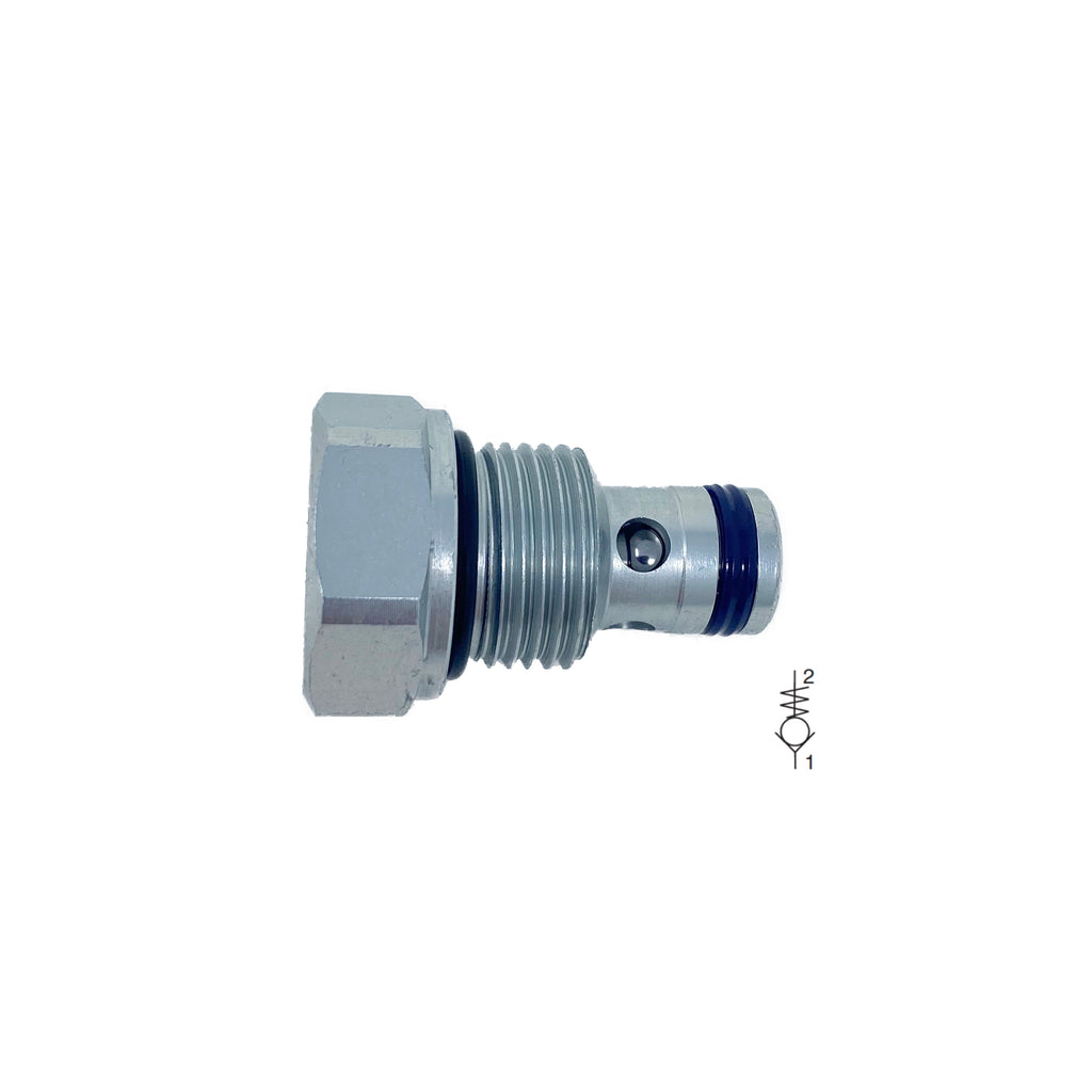 The Argo-Hytos SC1F-A2 cartridge-style check valve can be used as a blocking or load-holding device. The cartridge has a ball check which is closed by a spring until sufficient pressure is applied at Port 1 to open flow to Port 2.