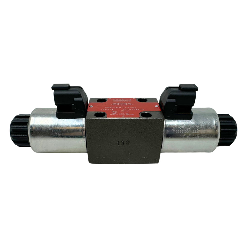 The Argo-Hytos PRM2-06 is a direct acting proportional control valve with optional integrated analog electronics (OBE) with a D03 subplate mounting interface. This valve is used for directional and speed control of hydraulic actuators. The valve opening and resulting flow rate can be modulated continuously in proportion to the reference signal, and can be controlled directly by a current control supply unit. The analog converter card allows for fine control of the valve spool position, reducing hysteresis and response time, and optimizing valve performance. The optional control box, which comprises one or two electronic control cards depending upon the number of controlled solenoids, can be mounted onto either solenoid. For models with two solenoids, the solenoid mounted opposite of the control box is connected to the box by a DIN connector, a two-lead cable, and a bushing. The connection of the control box with the supply source and with the control signal is implemented by a 4-pin connector of type M12x1. The electric control unit supplies the solenoid with current, which varies with the control signal.