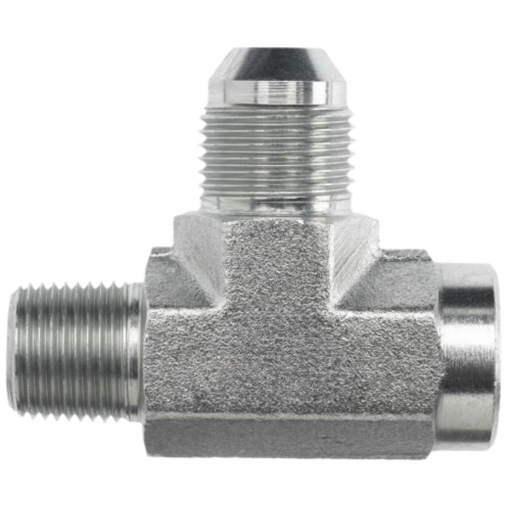 The Series 2613 Tee Male NPT x Female NPT x Male JIC adapters are durable carbon steel fittings designed to provide secure, leak-free connections in hydraulic and fluid power systems. These tee adapters feature a three-way design, allowing for efficient splitting or combining of fluid flow within a system. One end is equipped with a male NPT (National Pipe Tapered) connection, creating a tight, leak-proof seal through thread deformation, while the other end features a female NPT connection for a similar secure seal. The third connection is a male JIC (Joint Industry Council) connection, which uses a 37° tapered seat to create a reliable, mechanical seal. Made from strong carbon steel, the Series 2613 adapters offer excellent durability, corrosion resistance, and long-lasting performance, making them ideal for high-pressure systems and industrial applications that require reliable, flexible, and efficient fluid connections. These adapters are perfect for systems that demand secure and dependable fluid routing.