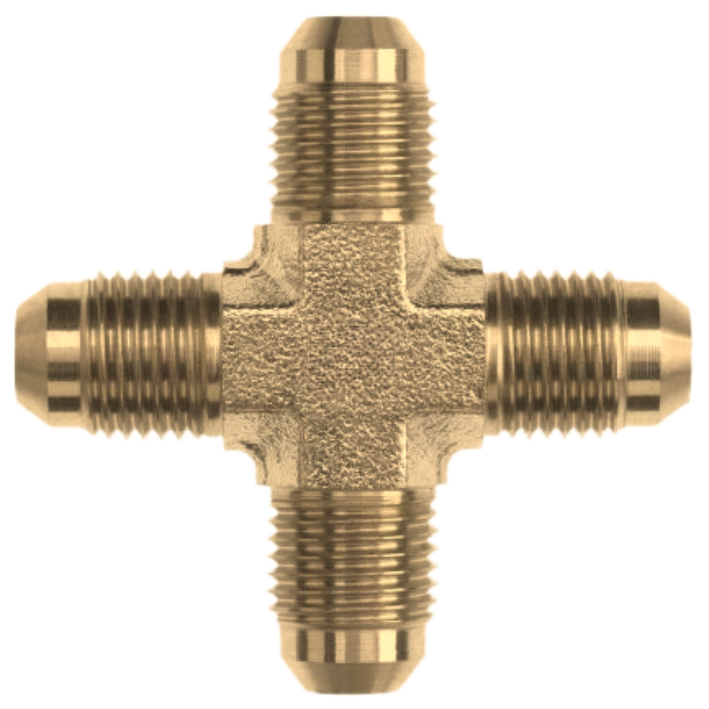 The Series 2650-B Cross Male JIC x Male JIC x Male JIC x Male JIC adapters are durable brass fittings designed for efficient fluid distribution in hydraulic and fluid power systems. These cross adapters feature four male JIC (Joint Industry Council) connections arranged in a cross shape, enabling the routing of fluid to multiple components. The male JIC connections, characterized by their 37° tapered seats, form a reliable, leak-free seal when connected to female coned seats, making them ideal for high-pressure applications and hose end connections. Made from brass, these adapters offer excellent corrosion resistance and strength, making them suitable for a wide range of industrial environments. The Series 2650-B adapters are engineered to provide dependable, long-lasting performance in fluid systems, ensuring efficient and secure fluid transfer in demanding applications.