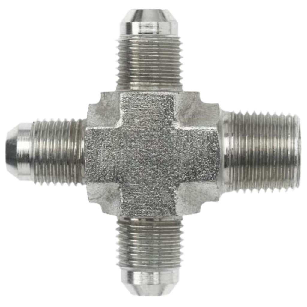The Series 2651 Cross Male JIC x Male NPT x Male JIC x Male JIC adapters are durable carbon steel fittings designed to efficiently route fluid within hydraulic and fluid power systems. These cross adapters feature a combination of male JIC (Joint Industry Council) connections and one male NPT (National Pipe Tapered) connection, arranged in a cross configuration to distribute fluid to multiple components. The male JIC connections, characterized by their 37° tapered seats, provide a secure, leak-free seal when mated with female coned seats, ideal for hose end connections. The male NPT connection uses tapered threads that form a metal-to-metal seal, ensuring a tight connection for fluid and gas transfer. Made from carbon steel, these adapters offer superior strength, durability, and corrosion resistance, making them ideal for high-pressure applications. The Series 2651 adapters provide reliable and efficient fluid transfer in demanding industrial environments.