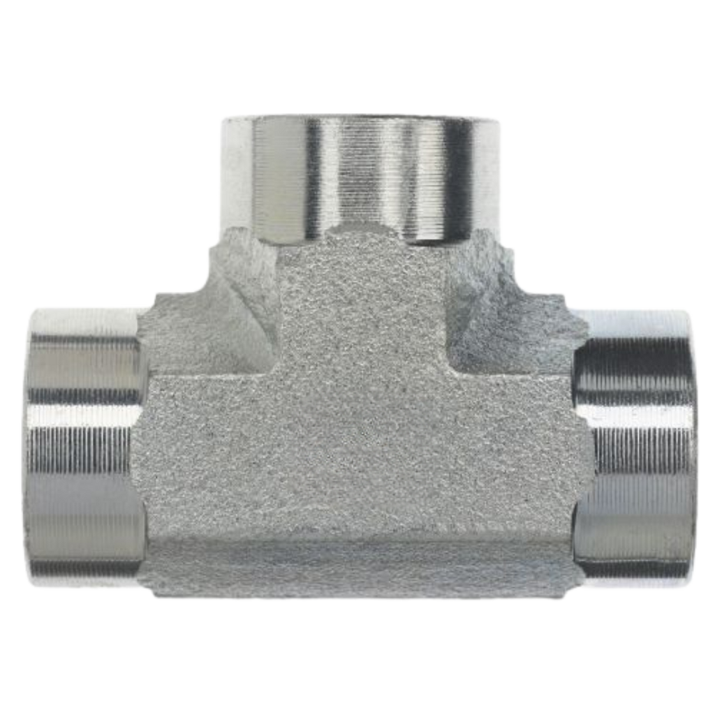 The Series 5605 Tee Female NPT x Female NPT x Female NPT rigid adapters are high-quality carbon steel fittings designed to provide secure, leak-free connections in hydraulic and fluid power systems. These tee adapters feature a three-way design, with three female NPT (National Pipe Tapered) connections, ideal for routing fluid between components in pipe systems. Female NPT connections are widely used for their metal-to-metal sealing design, where tapered threads form a leak-proof seal when tightened. This design is optimal for single assembly applications and is not recommended for connections that require frequent disassembly. Made from durable carbon steel, the Series 5605 adapters offer exceptional strength, corrosion resistance, and long-lasting performance. They provide a reliable solution for fluid transfer in industrial systems, ensuring efficient, flexible, and dependable fluid routing even in high-pressure applications.