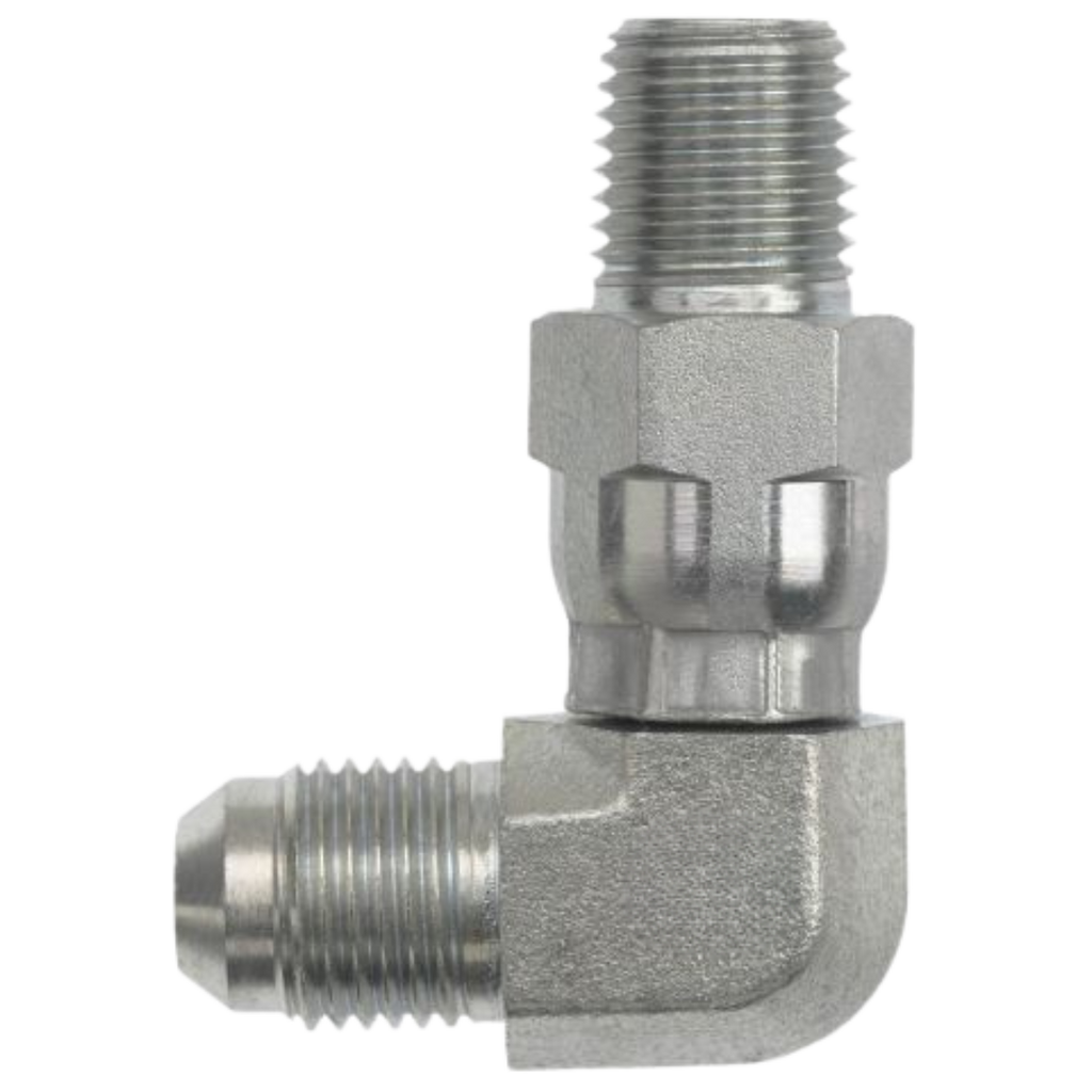 The Series 5701 90-Degree Angled Male JIC x Male NPTF swivel adapters are high-performance carbon steel fittings designed to provide secure, leak-free connections in hydraulic systems. Featuring a 90-degree angle, these adapters are ideal for efficiently routing hoses and pipes in tight or confined spaces. One end is equipped with a male JIC (Joint Industry Council) 37° flare connection, while the other end has a male NPTF (National Pipe Tapered Fuel) thread, ensuring a reliable, leak-tight seal through thread deformation. The swivel feature allows for flexible installation, making these adapters perfect for systems where precise alignment is required. Made from durable carbon steel, the Series 5701 offers exceptional strength, corrosion resistance, and long-lasting performance in high-pressure fluid power applications, making them a trusted choice for industrial hydraulic systems.