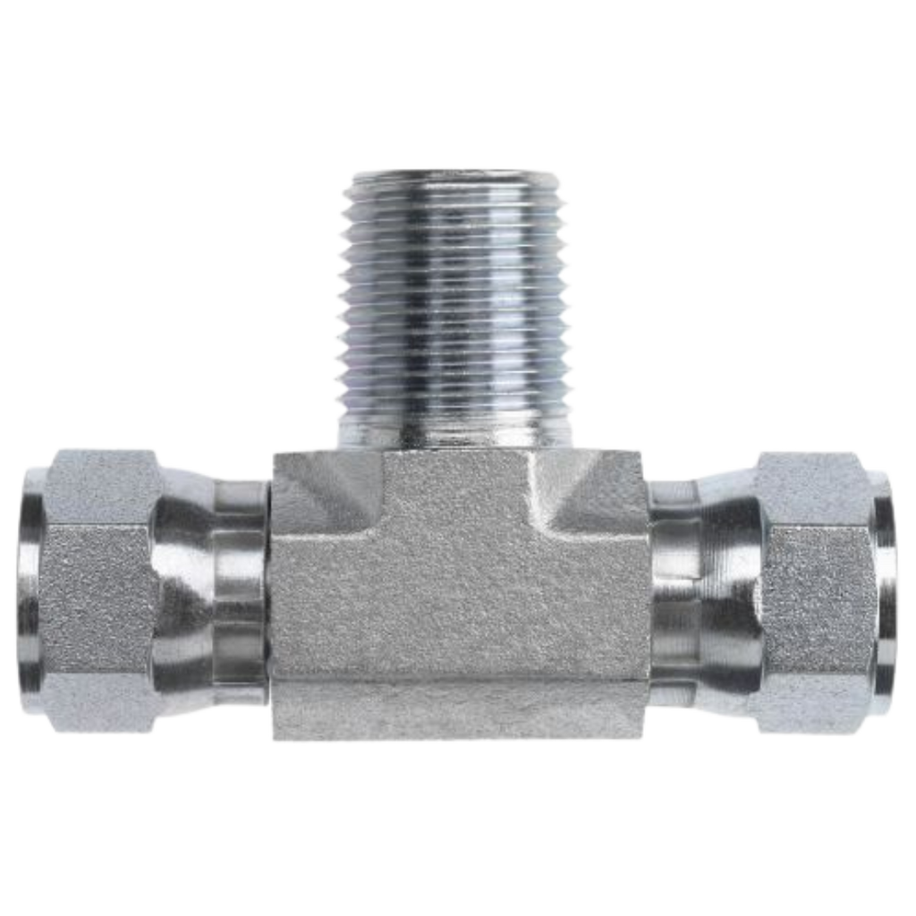 The Series 6604 Tee Female JIC Swivel x Female JIC Swivel x Male NPT adapters are robust carbon steel fittings designed for secure, leak-free connections in hydraulic and fluid power systems. These tee adapters feature a three-way design, allowing for the efficient splitting or combining of fluid flow within a system. Both ends are equipped with female JIC swivel connections, which use a 37° tapered seat to ensure a reliable, mechanical seal, while the third end features a male NPT (National Pipe Tapered) connection that provides a tight, leak-proof seal through thread deformation. Made from durable carbon steel, the Series 6604 adapters offer excellent strength, corrosion resistance, and long-lasting performance, making them ideal for high-pressure fluid systems and industrial applications. These adapters are perfect for systems that require dependable, flexible, and efficient fluid routing, providing secure connections for various hydraulic applications.