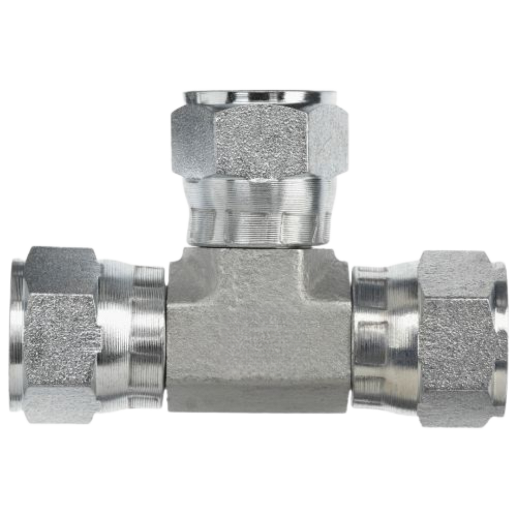 The Series 6606 Tee Female JIC Swivel x Female JIC Swivel x Female JIC Swivel adapters are durable carbon steel fittings designed to provide secure, leak-free connections in hydraulic and fluid power systems. These tee adapters feature a three-way design, with three female JIC Swivel connections, each providing flexibility in connecting hydraulic components. The female JIC Swivel connections feature 37° tapered seats, which create a tight, leak-proof seal when connected to male JIC fittings. Known for their reliable, high-performance sealing, these adapters are ideal for fluid power systems that require efficient fluid routing. Constructed from carbon steel, the Series 6606 adapters offer exceptional strength, corrosion resistance, and long-lasting durability, making them perfect for high-pressure applications. These adapters provide a dependable, flexible solution for fluid routing in industrial environments, ensuring efficient and reliable fluid transfer.