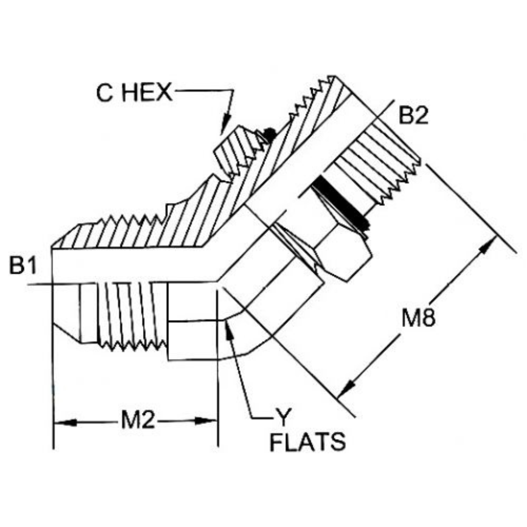 The Series 6802-SS 45-Degree MJIC x Male Adjustable ORB adapters, made from high-quality stainless steel, are ideal for fluid power systems, particularly in high-pressure applications. These adapters feature male JIC (Joint Industry Council SAE J514) fittings with 37° tapered seats, which create a secure mechanical seal when the male flared seat contacts the female coned seat. The male ORB (O-Ring Boss) connection uses a straight thread with an O-ring, which forms a reliable seal when compressed into a chamfered surface on the female port. This design, recommended by the National Fire Protection Association (NFPA) for leak prevention, ensures a secure and leak-free connection in hydraulic systems. It's important to avoid mixing SAE 37° and SAE 45° fittings, as their different seat angles can lead to leakage. Proper measurement of seat angles is essential for maintaining a reliable, high-performance connection.