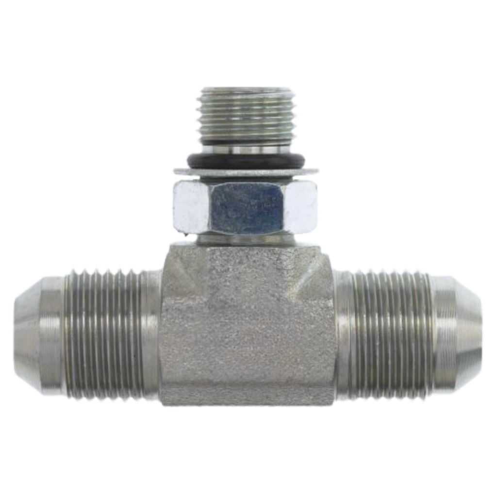 The Series 6803-NWO Tee Male JIC x Male JIC x Male Adjustable ORB adapters are high-quality carbon steel fittings designed to provide secure, leak-free connections in hydraulic and fluid power systems. These tee adapters feature a three-way design, allowing for efficient distribution or splitting of fluid flow within a system. The male JIC (Joint Industry Council) connections on two sides use a 37° tapered seat to create a reliable, mechanical seal, while the third end features a male adjustable ORB (O-Ring Boss) connection, providing a flexible and leak-proof seal via an O-ring. The adjustable ORB connection offers the benefit of easy alignment and adjustment, ensuring a perfect fit without compromising the seal. Made from durable carbon steel, the Series 6803-NWO adapters offer excellent strength, corrosion resistance, and long-lasting performance, making them ideal for high-pressure fluid systems and industrial applications requiring reliable, flexible, and efficient connections. These adapters are perfect for systems that demand dependable fluid routing and secure connections in demanding environments.