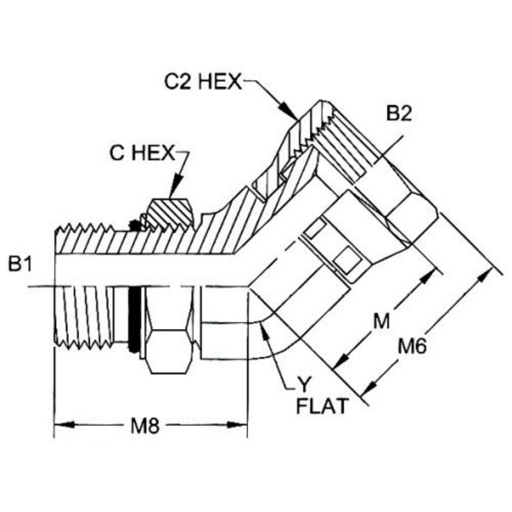The Series 6810-NWO 45-Degree Male Adjustable ORB x Female JIC Swivel adapters are designed for high-pressure hydraulic systems, combining two reliable connection styles: SAE J1926 Straight Thread O-Ring Boss (ORB) and SAE J514 JIC/37° Hydraulic. The male ORB connection features a straight thread with an O-ring, which seals when compressed into a chamfered surface on the female port, ensuring a leak-free connection. The female JIC connection, commonly used in fluid power systems, has a 37° coned seat that forms a mechanical seal with the male flared seat. The swivel design offers flexibility in installations, allowing easy orientation adjustments while maintaining secure, reliable connections. These adapters are ideal for applications requiring high-pressure performance and effective leak prevention, and they meet the National Fire Protection Association (NFPA) recommendations for hydraulic systems.