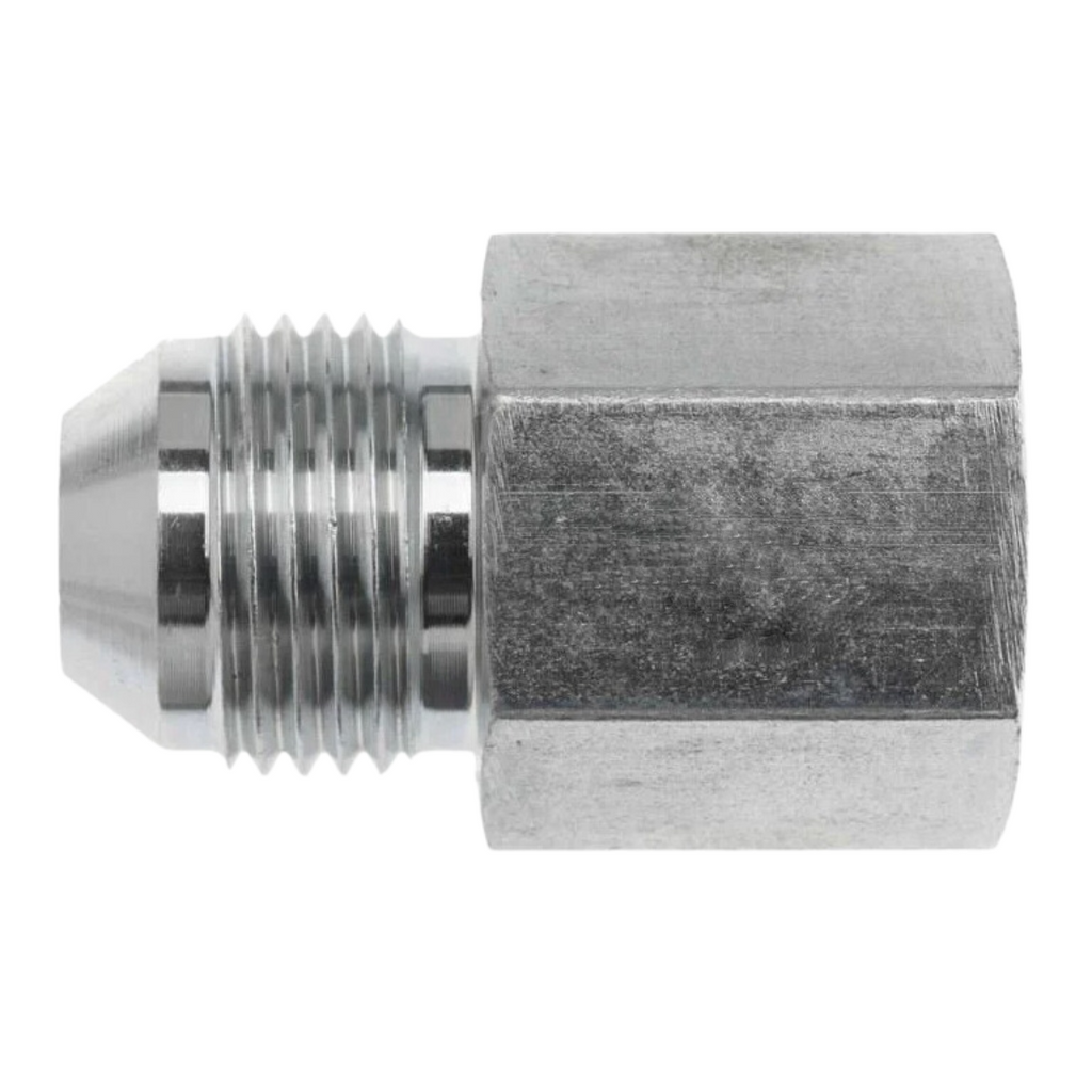The Series 7003 Straight Male JIC x Female BSPP hydraulic adapters, made from durable carbon steel, are essential components designed for secure fluid connections in hydraulic systems. Featuring a male JIC (Joint Industry Council) end, these adapters utilize a 37-degree flare seating surface and parallel threads, as defined by SAE J514, making them common in fluid power applications due to their reliability. The seal is formed by establishing contact between the male flared seat and the female coned seat, creating a strong mechanical connection. On the other side, the female BSPP (British Standard Pipe Parallel) connection is comparable to NPSM male fittings but typically has a different thread pitch. A captive seal is achieved using metal-to-metal angled surfaces or a combination of metal and an O-ring, ensuring a leak-proof connection. The female swivel BSPP features a tapered nose flareless swivel, where the seal occurs on the cone seat of the male connector. Thread sizes are often expressed as fractional dimensions preceded by "G" for parallel threads and "R" for tapered threads, allowing for easy compatibility with various systems. These adapters are ideal for professionals seeking dependable hydraulic solutions in diverse applications.