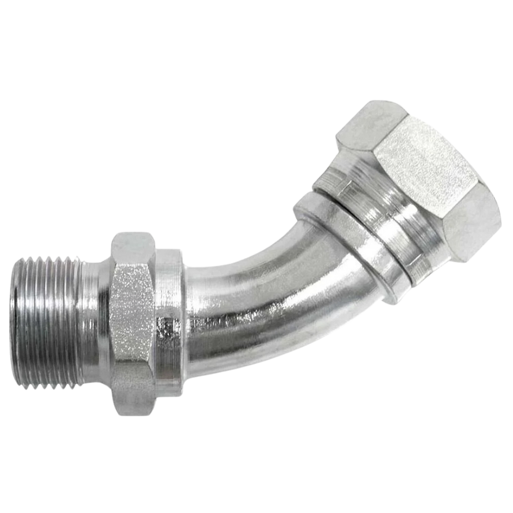 Our Series 9124 Swept 45-Degree Male BSPP x Female BSPP Swivel Adapters, made from high-quality carbon steel, are designed to provide efficient and reliable connections in hydraulic systems. Featuring a 45-degree angle, these adapters allow for easier hose routing in tight spaces while maintaining a secure, leak-free connection. The male BSPP end has a parallel thread and a flareless swivel connection, while the female BSPP end also has parallel threads, ensuring a robust, metal-to-metal seal. These adapters are perfect for systems requiring flexible installation and high-pressure performance, making them an excellent choice for fluid power professionals seeking durable, long-lasting solutions.