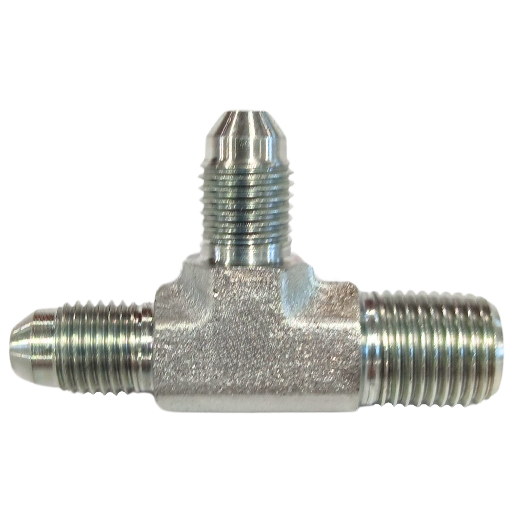 The Series 9163 Run Tee Male JIC x Male JIC x Male BSPT adapters are durable carbon steel fittings designed to provide secure, leak-free connections in hydraulic and fluid power systems. These run tee adapters feature a three-way design, enabling fluid to be routed through a primary line while creating a branch line at a 90-degree angle. Both ends are equipped with male JIC (Joint Industry Council) connections, which use a 37° tapered seat to create a reliable, mechanical seal. The third end features a male BSPT (British Standard Pipe Tapered) connection, which provides a tight, leak-proof seal through thread deformation, making it ideal for applications requiring high pressure and efficient fluid flow. Made from robust carbon steel, the Series 9163 adapters offer excellent strength, corrosion resistance, and long-lasting performance, making them perfect for industrial and high-pressure systems. These adapters are perfect for systems that require reliable fluid distribution and efficient connections in demanding environments.