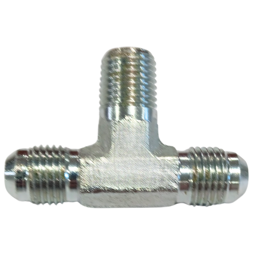 The Series 9164 Branch Tee Male JIC x Male JIC x Male BSPT adapters are high-quality carbon steel fittings designed for secure, leak-free connections in hydraulic and fluid power systems. These branch tee adapters feature a three-way design, allowing for the efficient distribution of fluid flow into multiple paths within a system. Both ends are equipped with male JIC (Joint Industry Council) connections, which use a 37° tapered seat to create a strong, mechanical seal. The third end features a male BSPT (British Standard Pipe Tapered) connection, providing a tight, leak-proof seal through thread deformation. Made from durable carbon steel, the Series 9164 adapters offer exceptional strength, corrosion resistance, and long-lasting performance, making them perfect for high-pressure fluid systems and industrial applications. These adapters are ideal for systems that require reliable, flexible, and efficient fluid routing in demanding environments.