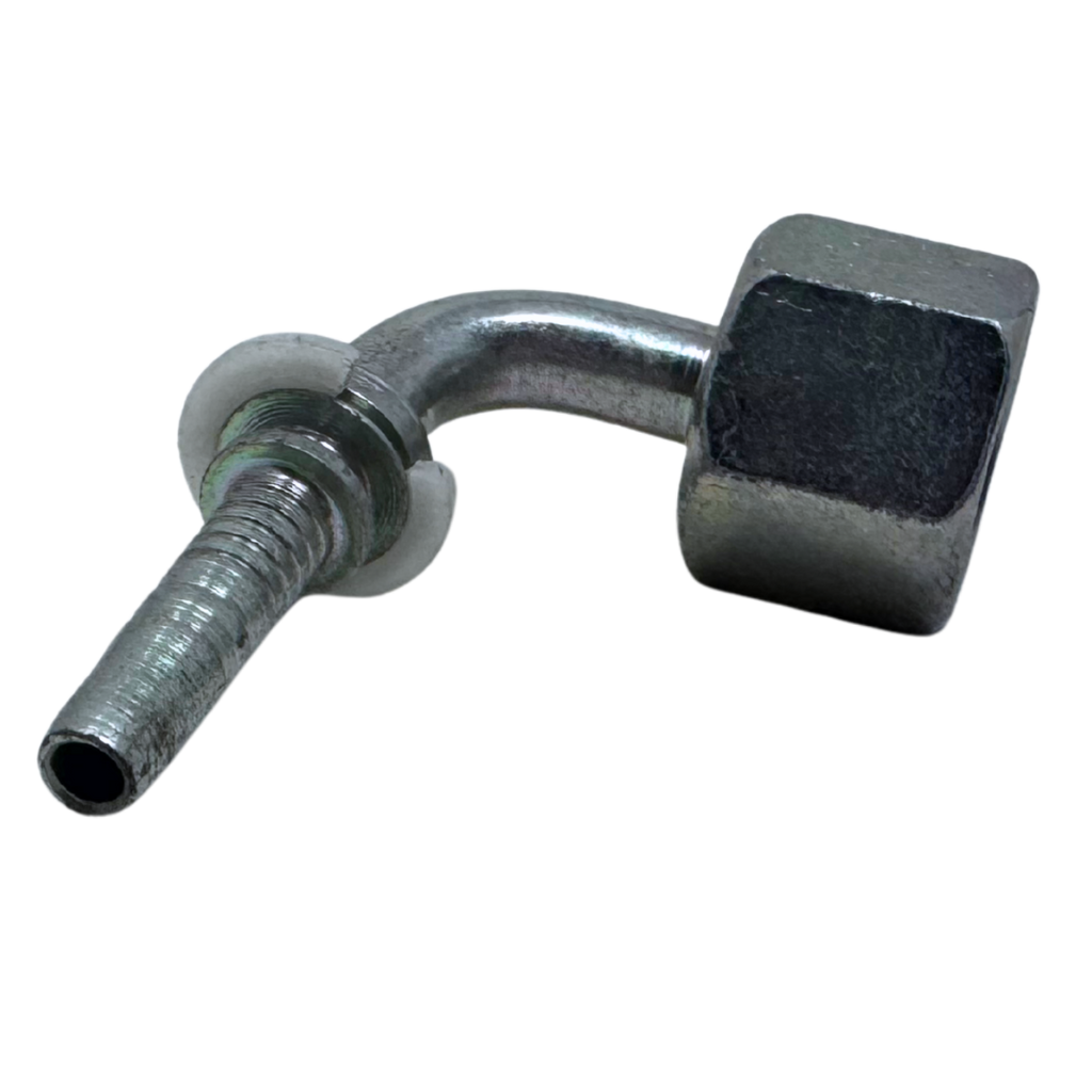 The Alfagomma A-FM9H Two-Piece Fittings are designed for heavy-duty applications requiring a 90-degree bend. Made of durable carbon steel, these fittings feature a hose end with a 90° metric O-ring female swivel and a 24° seat, ideal for use with DIN 3865 heavy-duty DIN tubes. They are compatible with a wide range of hoses, including wire and textile braided hoses, thermoplastic hoses, Flexor 4, PTFE hoses, and Alfabiotech 3000 and 4000 hoses, sized from ³⁄₁₆" to 2" in diameter. Ferrules are essential components that secure the hose to the fitting, ensuring a leak-proof connection. The key difference between two-piece and one-piece fittings lies in their design: two-piece fittings consist of separate parts, offering easier maintenance and part replacement, while one-piece fittings are a single solid unit. Two-piece fittings are versatile and often preferred for their flexibility and ease of maintenance in industrial settings.