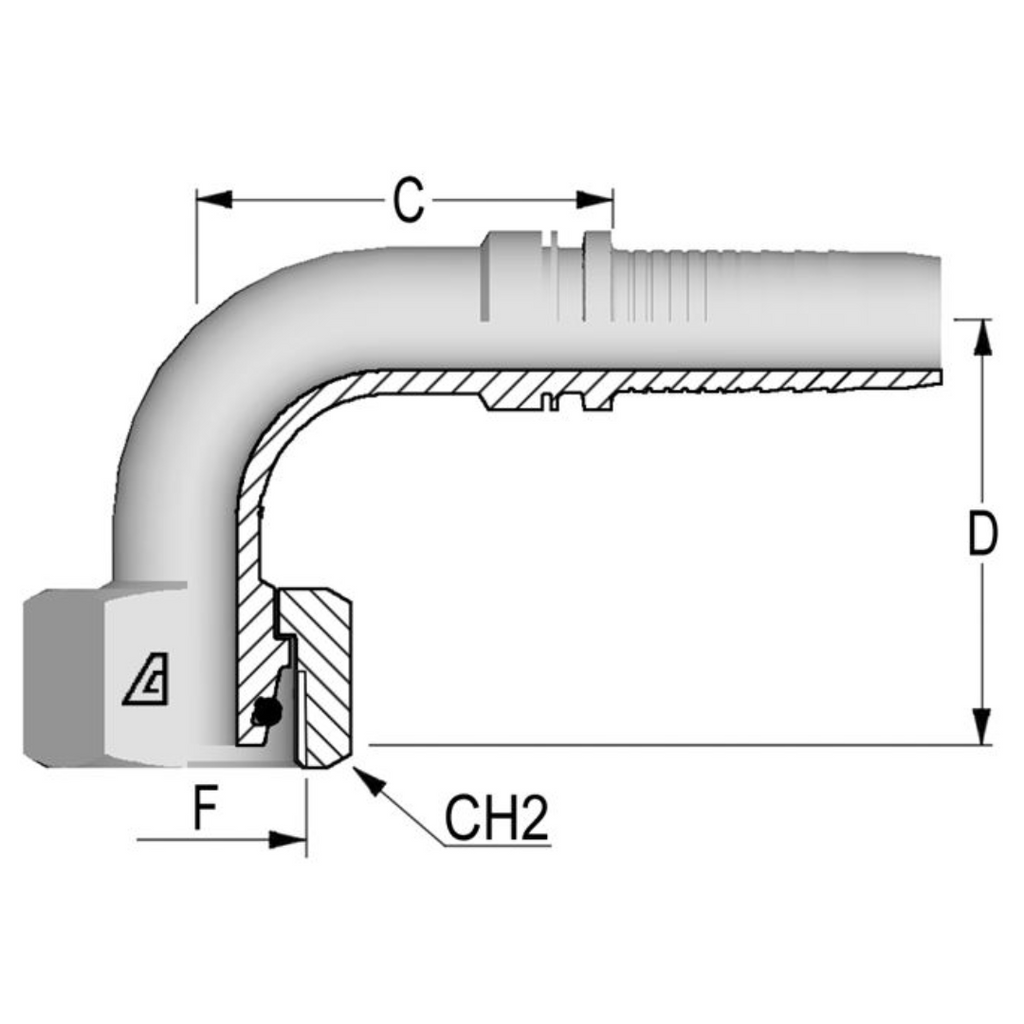 The Alfagomma A-FM9L Two-Piece Fittings are 90-degree carbon steel hose end fittings designed for connecting hoses to metric O-ring female swivel connections with a 24° seat, specifically used with DIN 3865 light-duty DIN tubes. These fittings are part of the A Series and are compatible with wire and textile braided hoses, thermoplastic hoses, Flexor 4, PTFE hoses, and smaller ID spiral wire reinforced hoses, ranging from ³⁄₁₆" to 2" in diameter. Ferrules are small metal pieces that secure the hose to the fitting, ensuring a tight, leak-free connection. The main difference between two-piece and one-piece fittings is that two-piece fittings consist of separate components, allowing for flexibility and easier maintenance, while one-piece fittings are a single, fixed unit, which offers more durability but less flexibility for repairs or adjustments. The two-piece design is ideal for a wide range of applications, providing reliable, long-lasting performance in fluid systems.