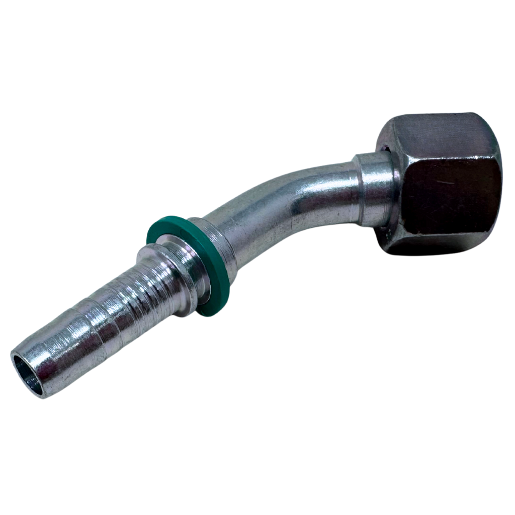 The Alfagomma A-FBO4 Two-Piece Fittings are designed to connect hoses to BSP (British Standard Pipe) O-ring female swivel 60° cone connections at a 45-degree angle. Made from carbon steel, these fittings consist of two parts: the hose end and a separate O-ring female swivel. The ferrules, small cylindrical rings, are used to secure the hose to the fitting, ensuring a tight seal that prevents leaks under pressure. The key difference between two-piece and one-piece fittings is that two-piece fittings allow for easier maintenance, as each component can be replaced individually, while one-piece fittings are a single unit that cannot be separated. The A-FBO4 fittings are suitable for use with wire and textile braided hoses, thermoplastic hoses, Flexor 4, PTFE hoses, and smaller ID spiral wire reinforced hoses, providing a reliable and high-performance solution for fluid systems.