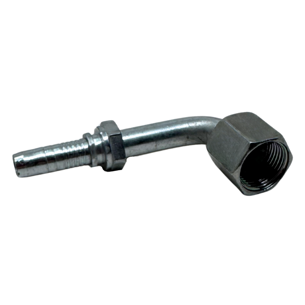The Alfagomma A-FJ9S Two-Piece Fittings are 90-degree, carbon steel fittings designed for use with wire and textile braided hoses, thermoplastic hoses, Flexor 4, PTFE hoses, and Alfabiotech hoses ranging from ³⁄₁₆" to 2" in diameter. These fittings feature a two-piece insert, which includes a ferrule—a metal or plastic component that compresses the hose securely onto the fitting, ensuring a tight, leak-proof seal. The main difference between two-piece and one-piece fittings is that two-piece fittings are made of separate components—the ferrule and fitting body—offering more flexibility during installation and replacement, while one-piece fittings are pre-assembled for quicker use. The A-FJ9S fitting features a 90° JIC female swivel with a 37° seat and a short drop design, providing a strong, reliable connection for high-pressure fluid systems. Ideal for use with Alfabiotech 3000 (1 ¼" and 1 ½") and Alfabiotech 4000 (³⁄₈" to 1 ¼") hoses, as well as smaller ID spiral wire reinforced hoses, this fitting ensures long-lasting, secure hose connections for demanding industrial applications.