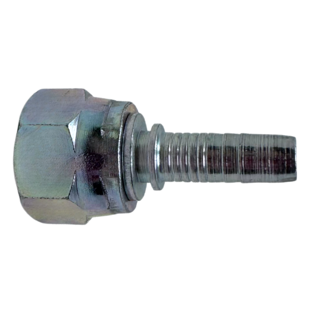 The Alfagomma A-FJSH Two-Piece Fittings are straight, carbon steel fittings designed to securely connect wire and textile braided hoses, thermoplastic hoses, Flexor 4, PTFE hoses, and Alfabiotech hoses ranging from ³⁄₁₆" to 2" in diameter. These fittings use a two-piece insert, which includes a ferrule—a metal or plastic component that compresses the hose onto the fitting to create a tight, leak-proof seal. The difference between two-piece and one-piece fittings is that two-piece fittings are made up of separate parts (the ferrule and fitting body), offering more flexibility for installation and easier replacement, while one-piece fittings are pre-assembled for quicker setup. The A-FJSH fitting features a JIC female 37° seat, providing a strong, reliable connection for high-pressure fluid systems. This fitting is ideal for use with Alfabiotech 3000 (1 ¼" and 1 ½") and Alfabiotech 4000 (³⁄₈" to 1 ¼") hoses, as well as smaller ID spiral wire reinforced hoses, ensuring secure, long-lasting hose connections in demanding industrial applications.