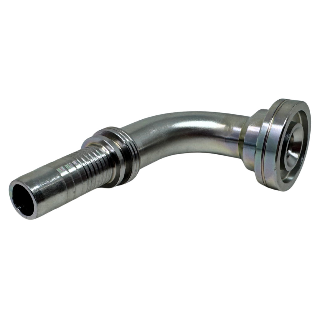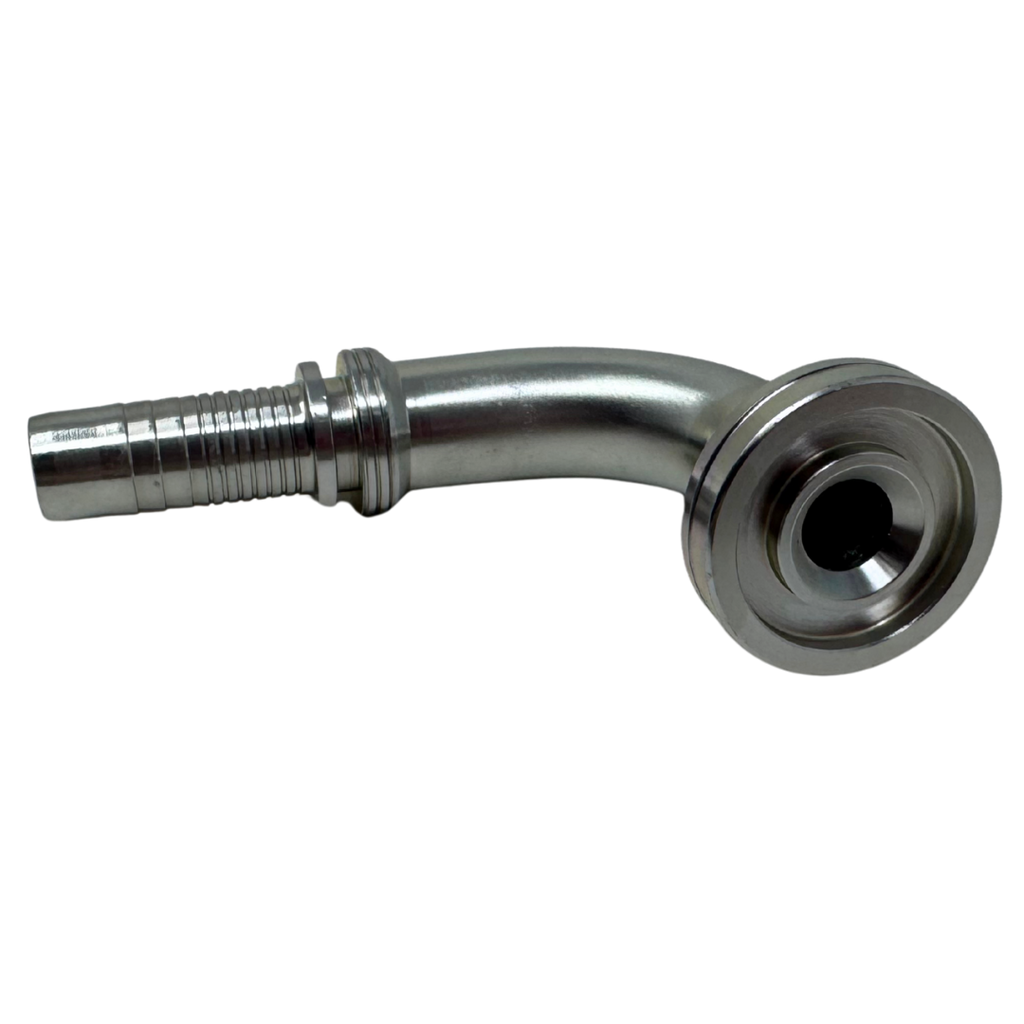 The Alfagomma A-C629 Two-Piece Fittings are 90-degree carbon steel hose fittings designed for durable, leak-proof connections in industrial fluid power systems. These fittings feature an O-ring flange that complies with SAE J518 Code 62, ensuring a secure and high-pressure seal. Ferrules are metal inserts that help secure the hose to the fitting by compressing it tightly, creating a strong, leak-resistant connection. The difference between two-piece and one-piece fittings is that two-piece fittings consist of separate components, such as the fitting and ferrule, allowing for easier maintenance, repair, and customization. In contrast, one-piece fittings are pre-assembled for quicker installation but offer less flexibility. The A-C629 Two-Piece Fittings are compatible with wire and textile braided hoses, thermoplastic hoses, Flexor 4, and PTFE hoses, as well as Alfabiotech 3000 and 4000 hoses in sizes ranging from ³⁄₁₆" to 2" ID, offering versatile and reliable solutions for a wide range of fluid handling applications.
