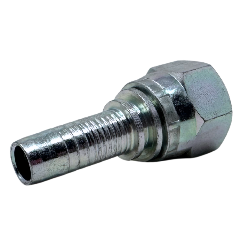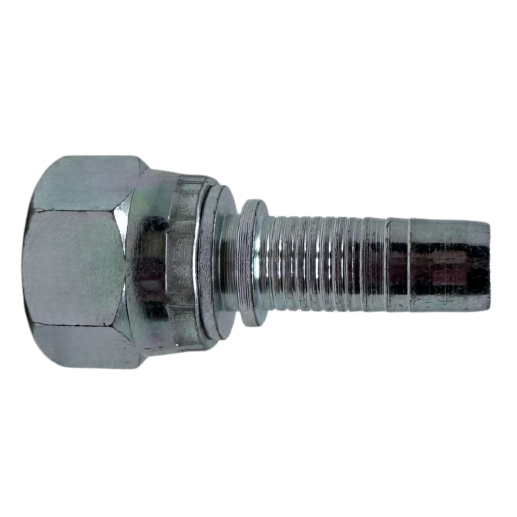 The Alfagomma A-FJSH Two-Piece Fittings are straight, carbon steel fittings designed to securely connect wire and textile braided hoses, thermoplastic hoses, Flexor 4, PTFE hoses, and Alfabiotech hoses ranging from ³⁄₁₆" to 2" in diameter. These fittings use a two-piece insert, which includes a ferrule—a metal or plastic component that compresses the hose onto the fitting to create a tight, leak-proof seal. The difference between two-piece and one-piece fittings is that two-piece fittings are made up of separate parts (the ferrule and fitting body), offering more flexibility for installation and easier replacement, while one-piece fittings are pre-assembled for quicker setup. The A-FJSH fitting features a JIC female 37° seat, providing a strong, reliable connection for high-pressure fluid systems. This fitting is ideal for use with Alfabiotech 3000 (1 ¼" and 1 ½") and Alfabiotech 4000 (³⁄₈" to 1 ¼") hoses, as well as smaller ID spiral wire reinforced hoses, ensuring secure, long-lasting hose connections in demanding industrial applications.