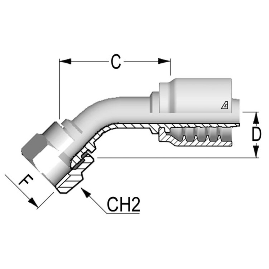 The Alfagomma One-Piece AlfaCrimp B-FJ45 Fitting is a 45-degree, carbon steel fitting designed to connect braided hoses to a 45° JIC (Joint Industrial Council) female 37° seat. This fitting uses a non-skive crimp design, meaning there’s no need to prepare or remove any part of the hose before installation, making the process faster and more convenient. A crimp fitting works by tightly compressing the hose onto the fitting, ensuring a strong, leak-proof seal. Braided hoses are flexible hydraulic hoses reinforced with layers of steel wire, providing extra strength and resistance to pressure. The 45° angle and JIC female 37° seat ensure a secure, reliable connection, making this fitting ideal for fluid power systems, hose repairs, and custom hose assemblies in high-pressure applications.