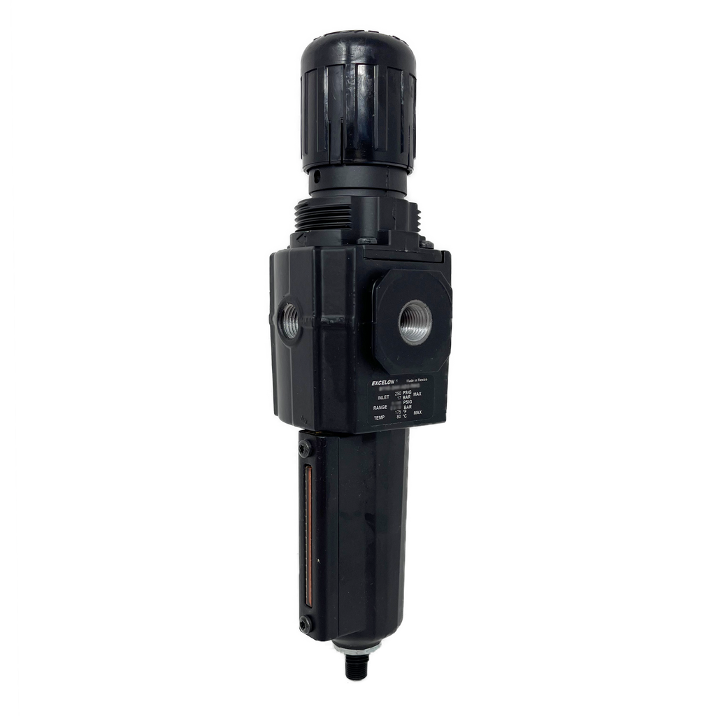 The Norgren Excelon Modular System allows for easy in-line installation with other Excelon products. These units offer high efficiency water and particle removal, a quick release bayonet bowl, a push to lock adjusting tamper-resistant knob, and an automatic or optional quarter-turn manual drain.
