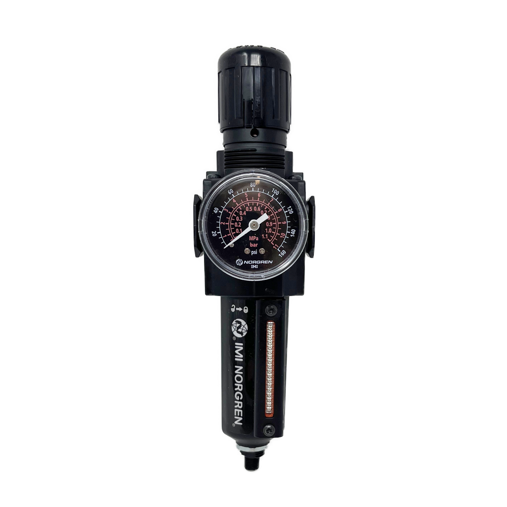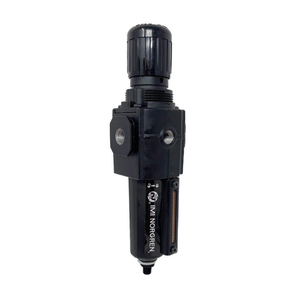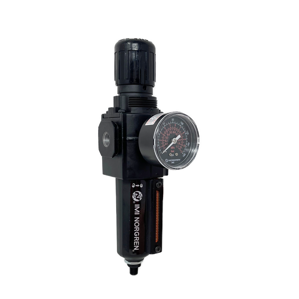 The Norgren filter regulator unit is our most popular single compressed air preparation unit. The filter regulator combines accurate pressure adjustment with bulk water (moisture) and particle removal (5 or 40 microns rating) in one unit. This benefits you by saving space and pneumatic connections for the same or improved performance.