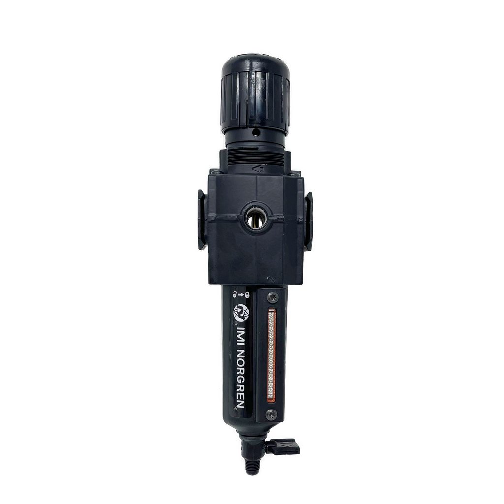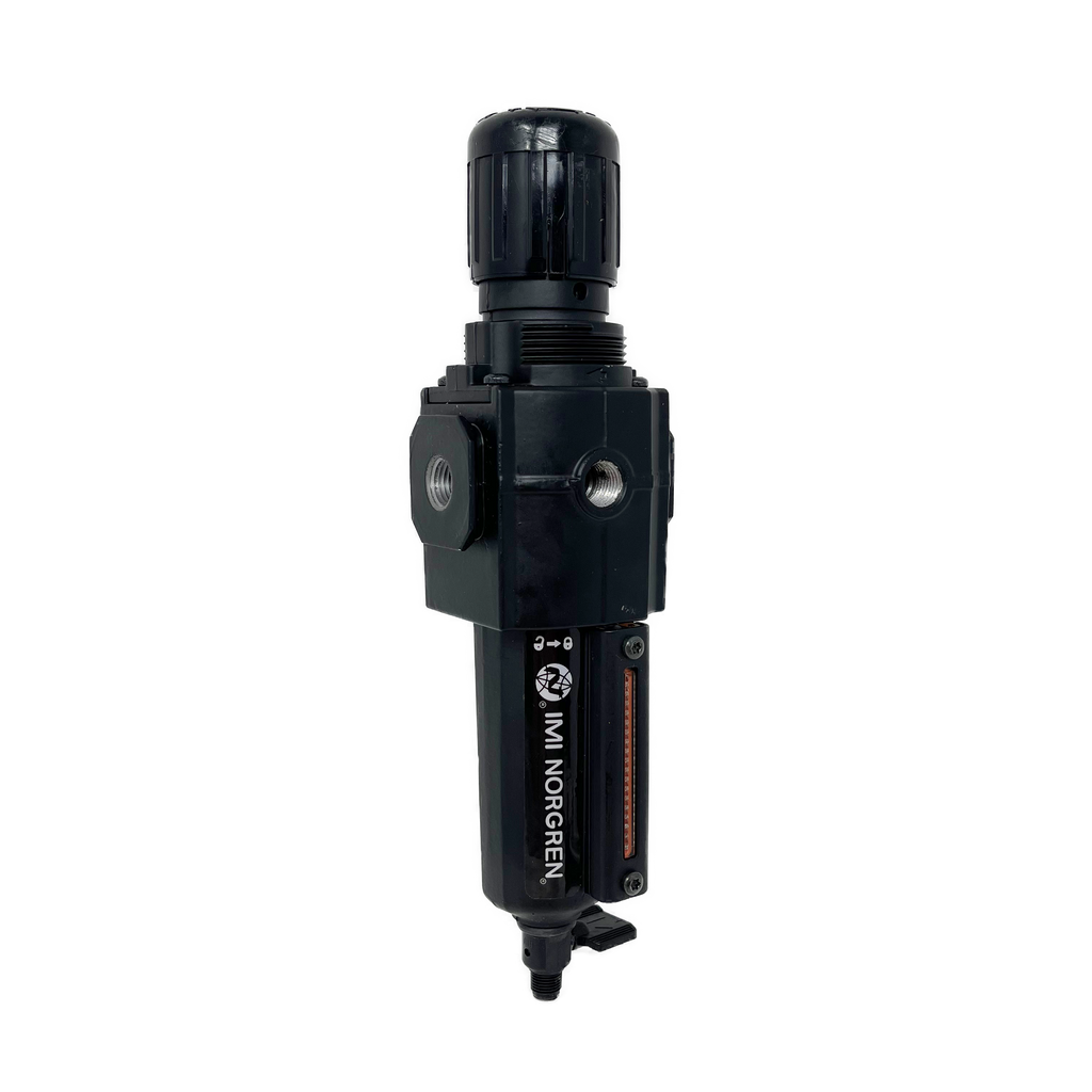 The Norgren filter regulator unit is our most popular single compressed air preparation unit. The filter regulator combines accurate pressure adjustment with bulk water (moisture) and particle removal (5 or 40 microns rating) in one unit. This benefits you by saving space and pneumatic connections for the same or improved performance.
