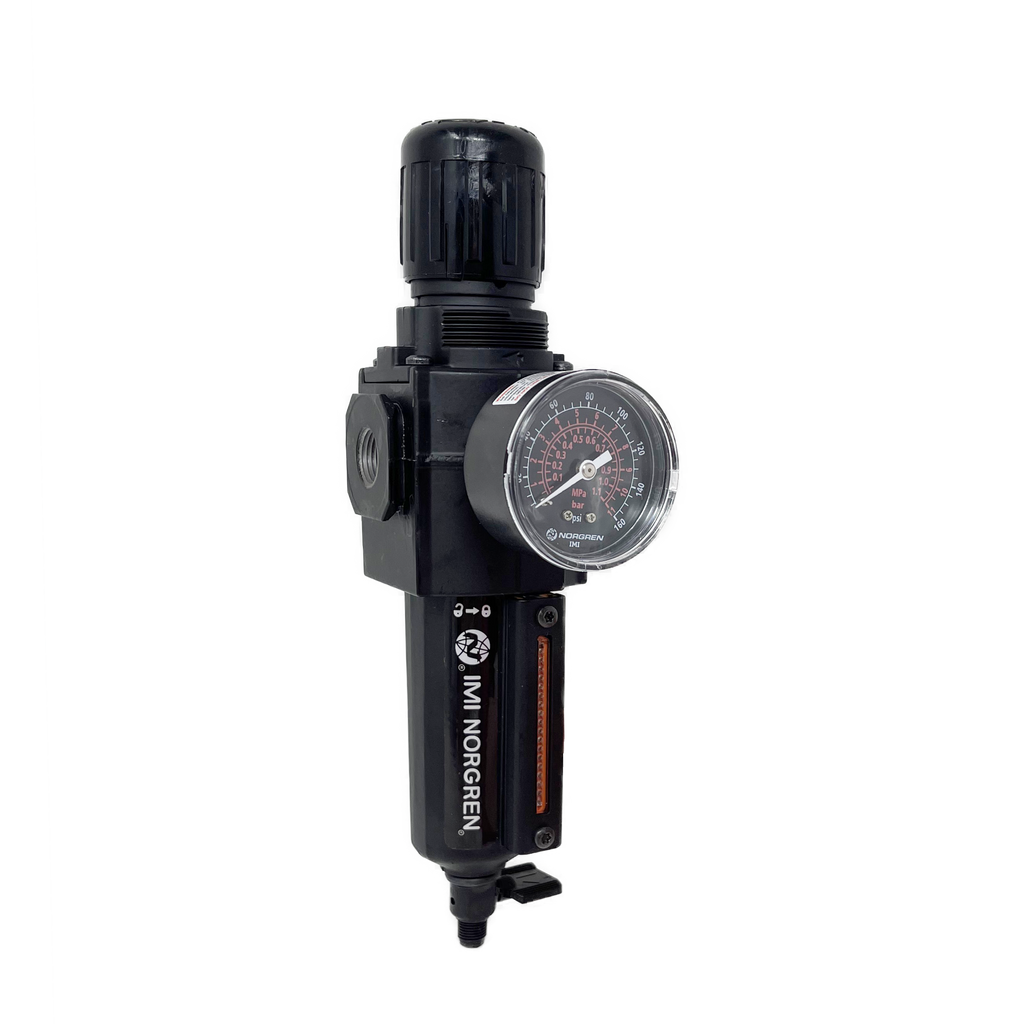 The Norgren filter regulator unit is our most popular single compressed air preparation unit. The filter regulator combines accurate pressure adjustment with bulk water (moisture) and particle removal (5 or 40 microns rating) in one unit. This benefits you by saving space and pneumatic connections for the same or improved performance.