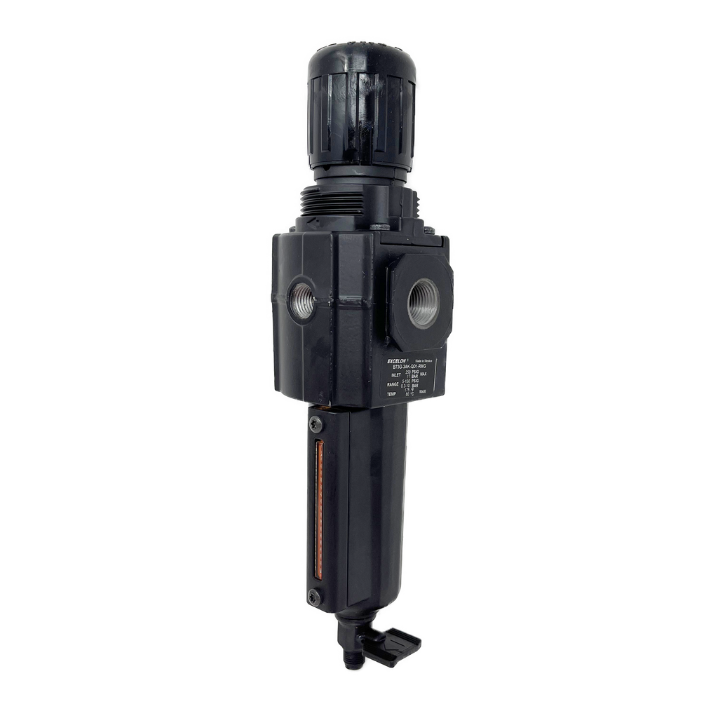 The Norgren Excelon Modular System allows for easy in-line installation with other Excelon products. These units offer high efficiency water and particle removal, a quick release bayonet bowl, a push to lock adjusting tamper-resistant knob, and an automatic or optional quarter-turn manual drain.