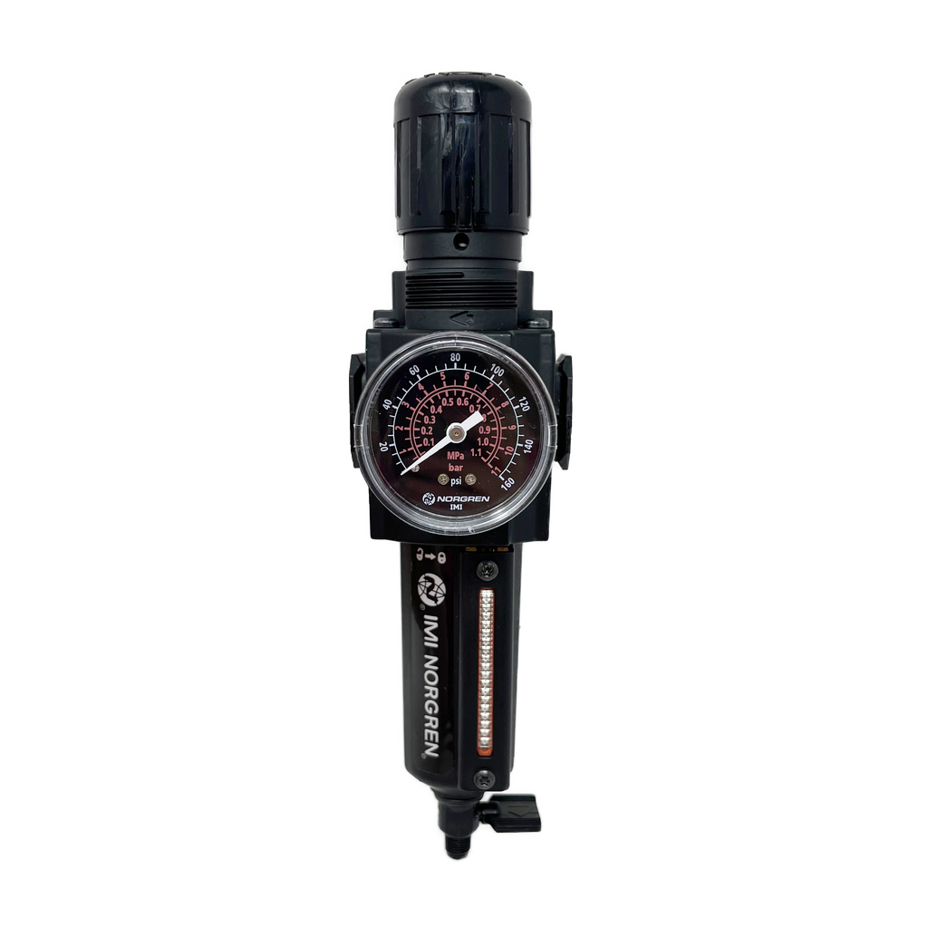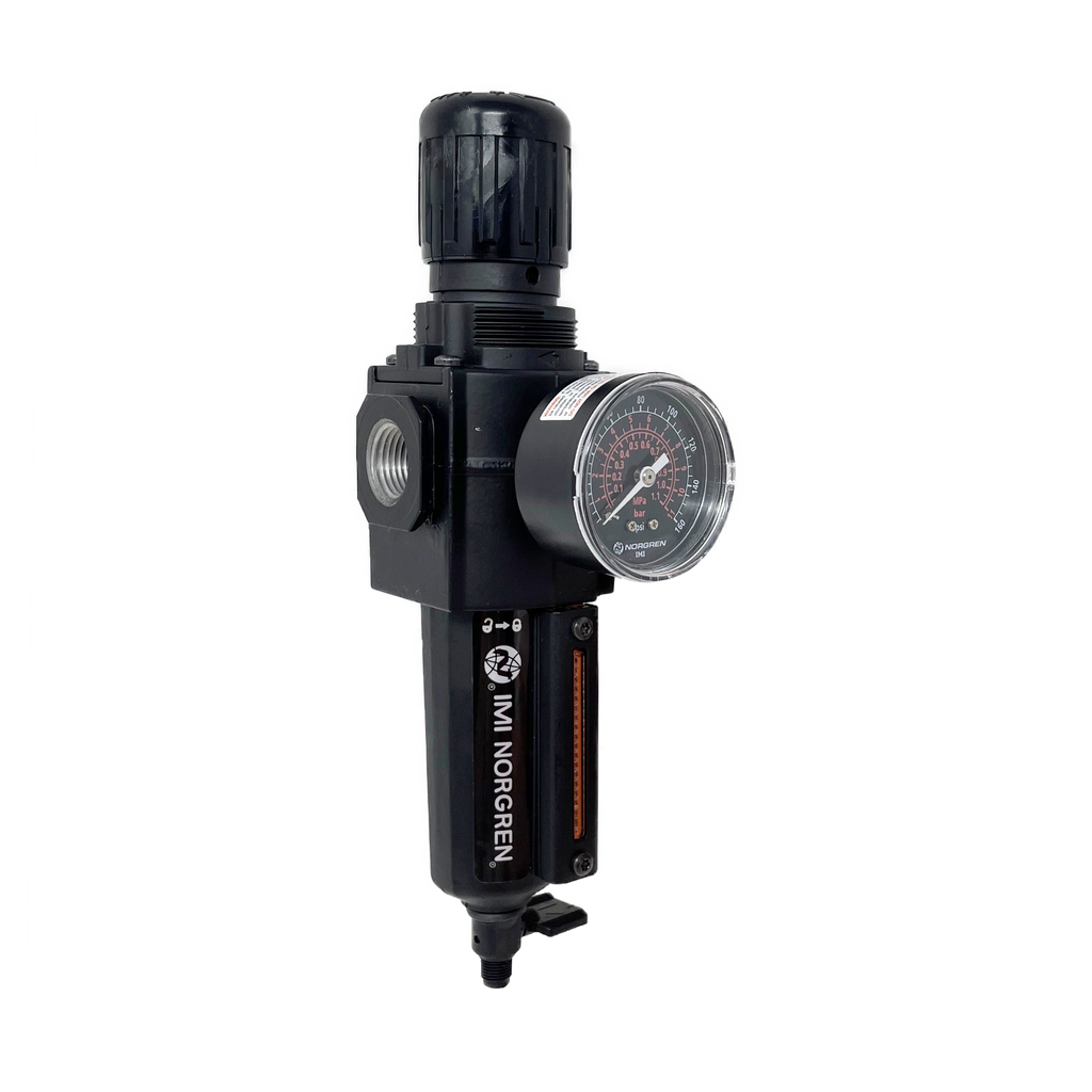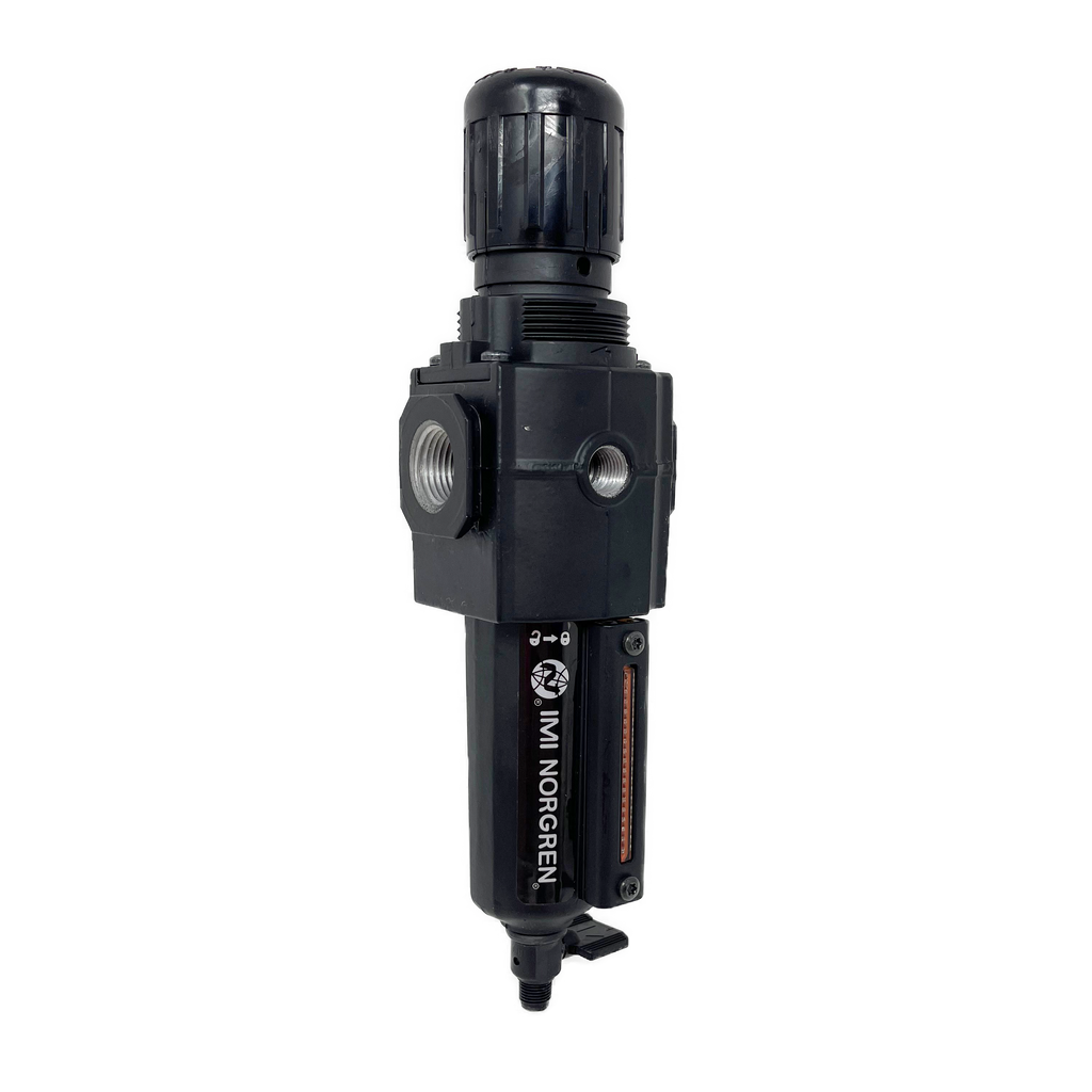 The Norgren filter regulator unit is our most popular single compressed air preparation unit. The filter regulator combines accurate pressure adjustment with bulk water (moisture) and particle removal (5 or 40 microns rating) in one unit. This benefits you by saving space and pneumatic connections for the same or improved performance.