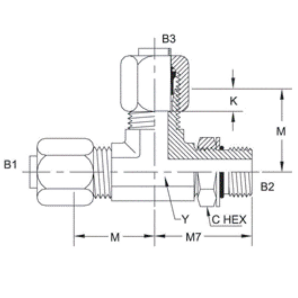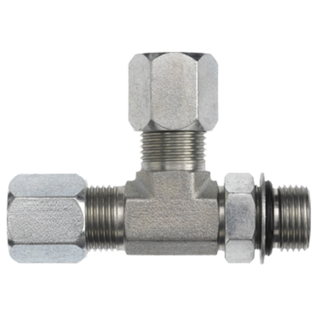 The Series C6804-NWO Tee Adapter, made from durable carbon steel, is a high-performance fitting designed to connect three sections of tubing in a hydraulic system. This tee adapter features Flareless Bite Type Tube Compression on two sides and a Male Adjustable ORB (O-Ring Boss) connection on the third side. The Flareless Bite Type fittings securely connect to tubing without the need for flaring, creating a leak-tight seal by compressing the ferrules into the tube. The Male Adjustable ORB connection uses a straight thread and an O-ring to form a reliable, adjustable seal, making it ideal for high-pressure applications. This versatile adapter is widely used in fluid power systems to ensure optimal fluid flow and prevent leaks, offering professionals a reliable solution for a variety of industrial applications.