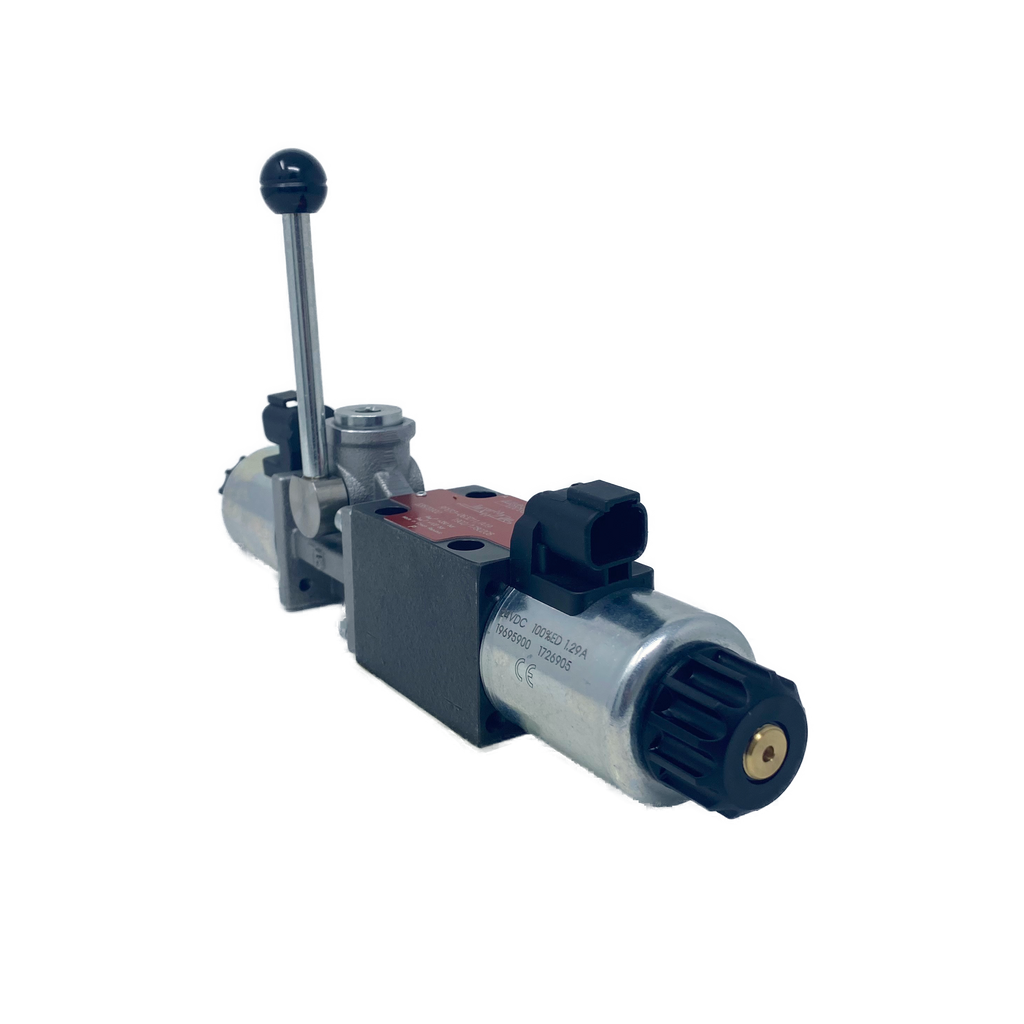 The Argo-Hytos RPER3-06 auxiliary override valve offers a lever override for On/Off solenoid valves of the type RPE3-06. Auxiliary lever operators allow the valve to be operated when the electrical system is de-energized, for example in emergency operation, electrical failures, or maintenance activities. The manual lever and actuation element can be rotated in 90-degree increments for flexible installation. When the valve is electrically operated, the hand lever remains in stopped in its neutral position. The lever override does not affect the performance of the base valve. The lever operator should never be used when the solenoid is energized.