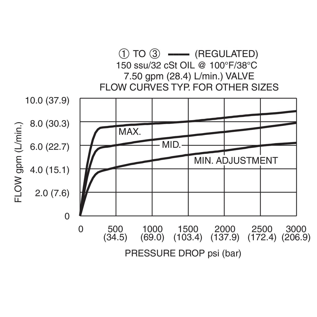 The Deltrol Fluid Products DFRA-100-3 Flow Regulator is an adjustable bypass-type cartridge valve that regulates priority flow while bypassing excess flow, regardless of downstream pressure. It maintains a constant flow rate from 1 to 10 gpm (with a maximum input of 10 gpm) and allows for adjustments of up to 40% of the maximum setting. The valve operates at pressures up to 3000 psi and is designed for reliable performance in temperatures ranging from -30°F to +250°F. It features pressure compensation for accurate flow control, with options for tamper-resistant adjustments and secure locking. Constructed from anodized aluminum, it is ideal for various industrial applications requiring precise flow regulation.