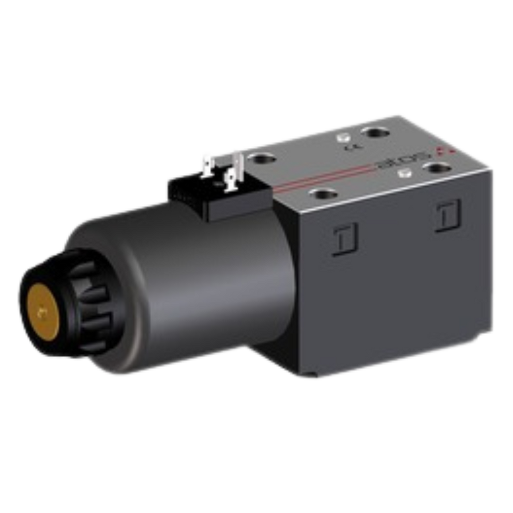 The Atos DKE Solenoid Directional Valve is a direct-acting, spool-type valve designed for precise hydraulic control. It features two or three positions and operates via threaded solenoids, which are certified to the North American standard cURus. The solenoids come in a wet-type, screwed-tube design, compatible with both AC and DC power supplies, and include an integrated manual override pin. Coils are interchangeable and can be easily replaced without tools, with standard protection rated at IP65 and optional IP67 connections. The valve body is engineered with 5 chambers for DC versions and 3 chambers for the standard AC version, providing efficient flow management with minimal pressure drops. The valve supports a maximum flow rate of 39.63 GPM (150 lpm) and a pressure rating of 5075 psi (350 bar), with a mounting surface of D05 (NG10) and ISO 4401 size 10.