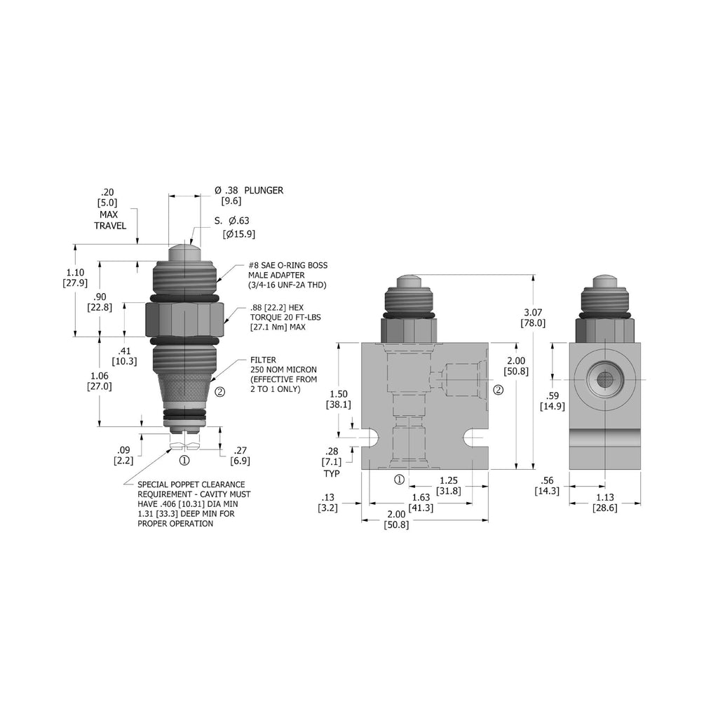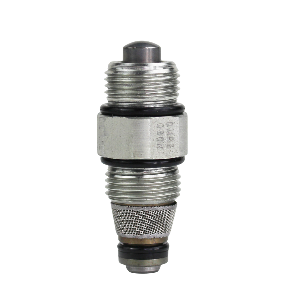 The Deltrol Fluid Products DMR2-080 is a zero-leak, plunger-operated cartridge valve designed for load-holding applications. It blocks flow in both directions by default but opens to allow fluid flow when the plunger is actuated. The required force to operate the plunger depends on the pressure in the system, plus an additional spring force. With a maximum pressure rating of 3000 PSI and a flow capacity of 5 GPM, this valve ensures long-term reliability with its hardened poppet and seat, and features a filter screen and industry-common cavity for easy integration. The valve operates efficiently in temperatures ranging from -30°F to +250°F and is compatible with mineral-based fluids.