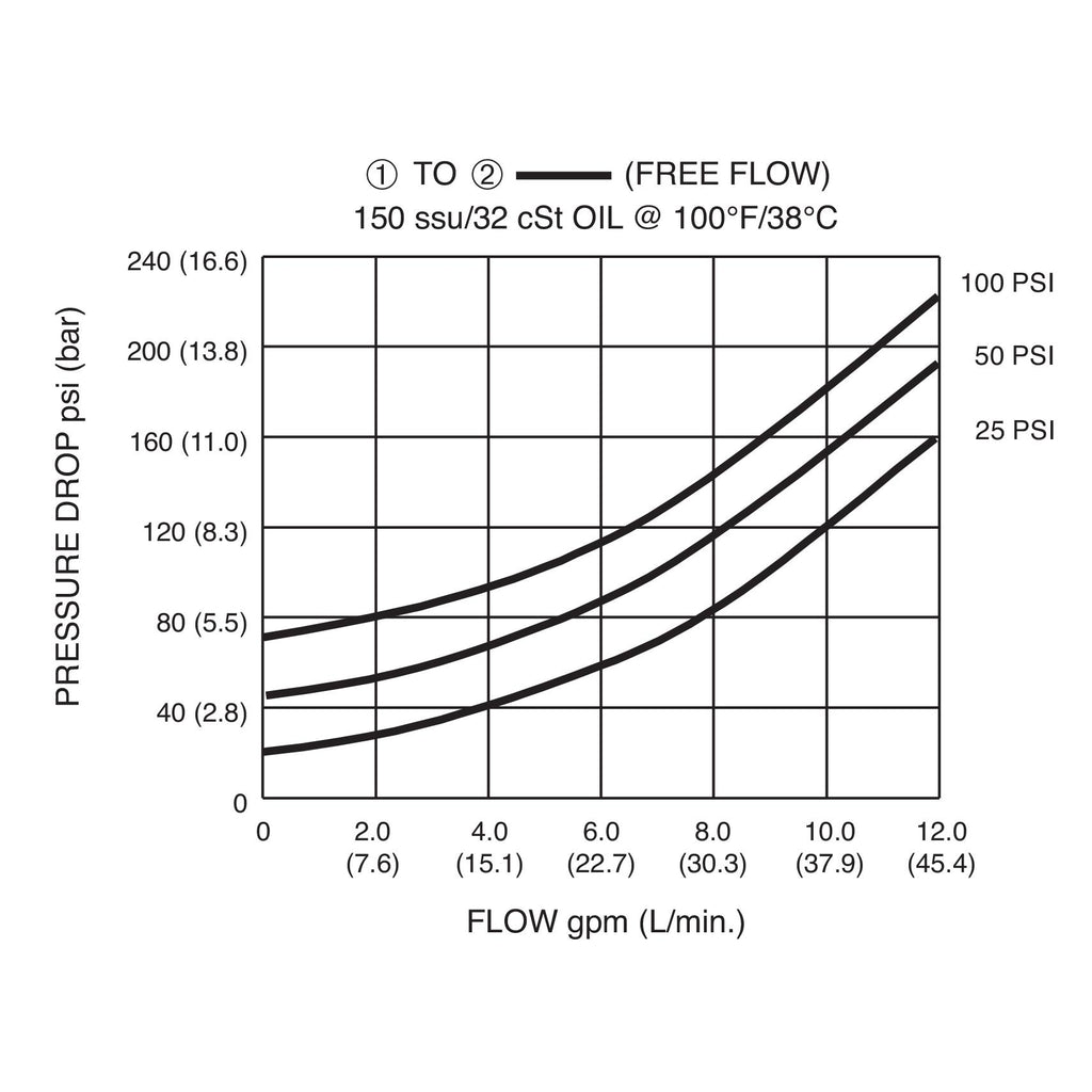 The Deltrol Fluid Products DPTC-100-P Motion Control Pilot-to-Close Check Valve is a cartridge valve designed to permit free flow in one direction while blocking flow in the opposite direction. It uses pilot pressure at port 3 to close the valve and prevent flow between ports 1 and 2. In normal operation, flow moves freely from 1 to 2, but when the pilot pressure is applied, it keeps the valve closed, halting the flow. This valve is ideal for load-holding and blocking applications, featuring a hardened poppet and seat for long-term durability and an industry-standard cavity design. It operates effectively at up to 3000 psi and supports flow rates up to 12 gpm.