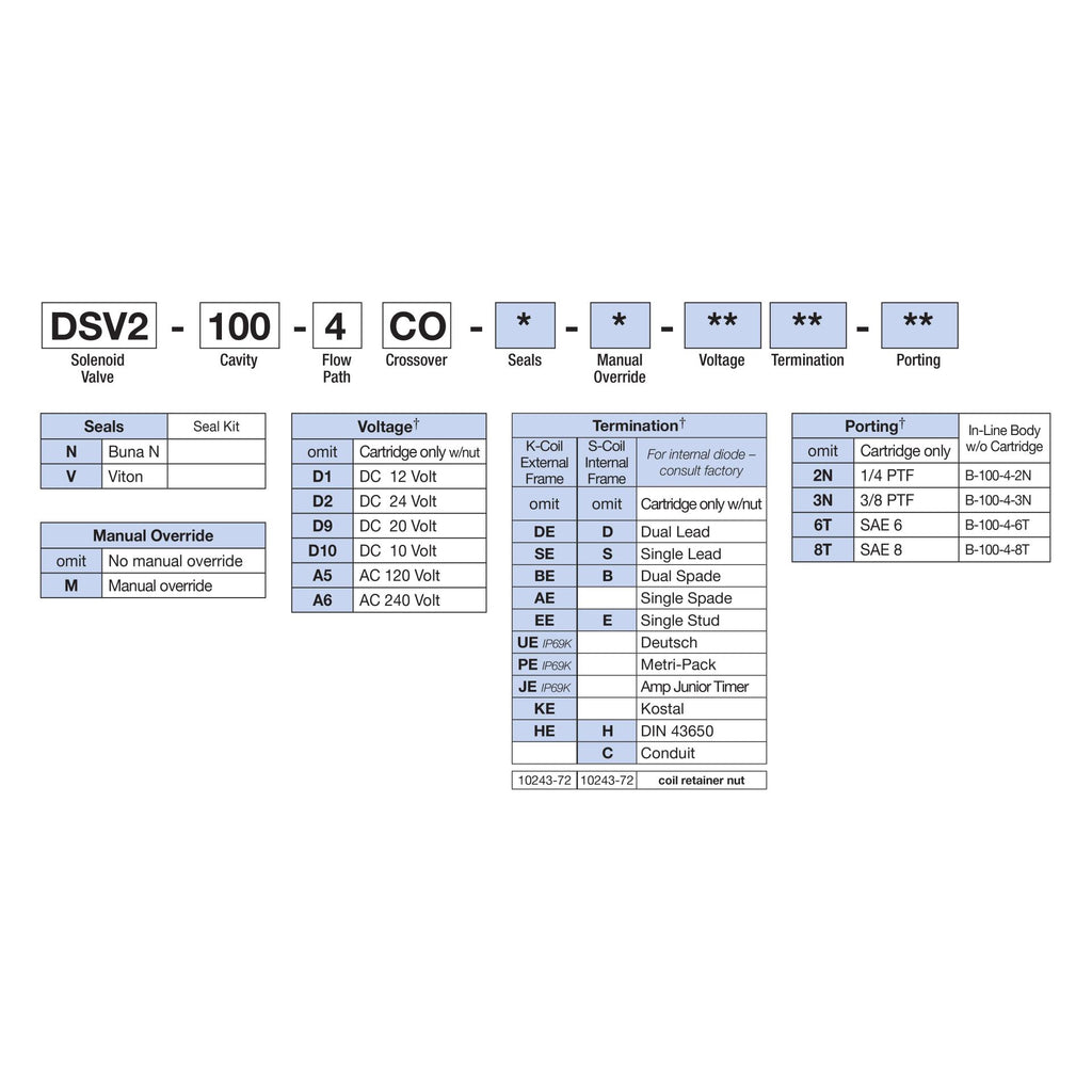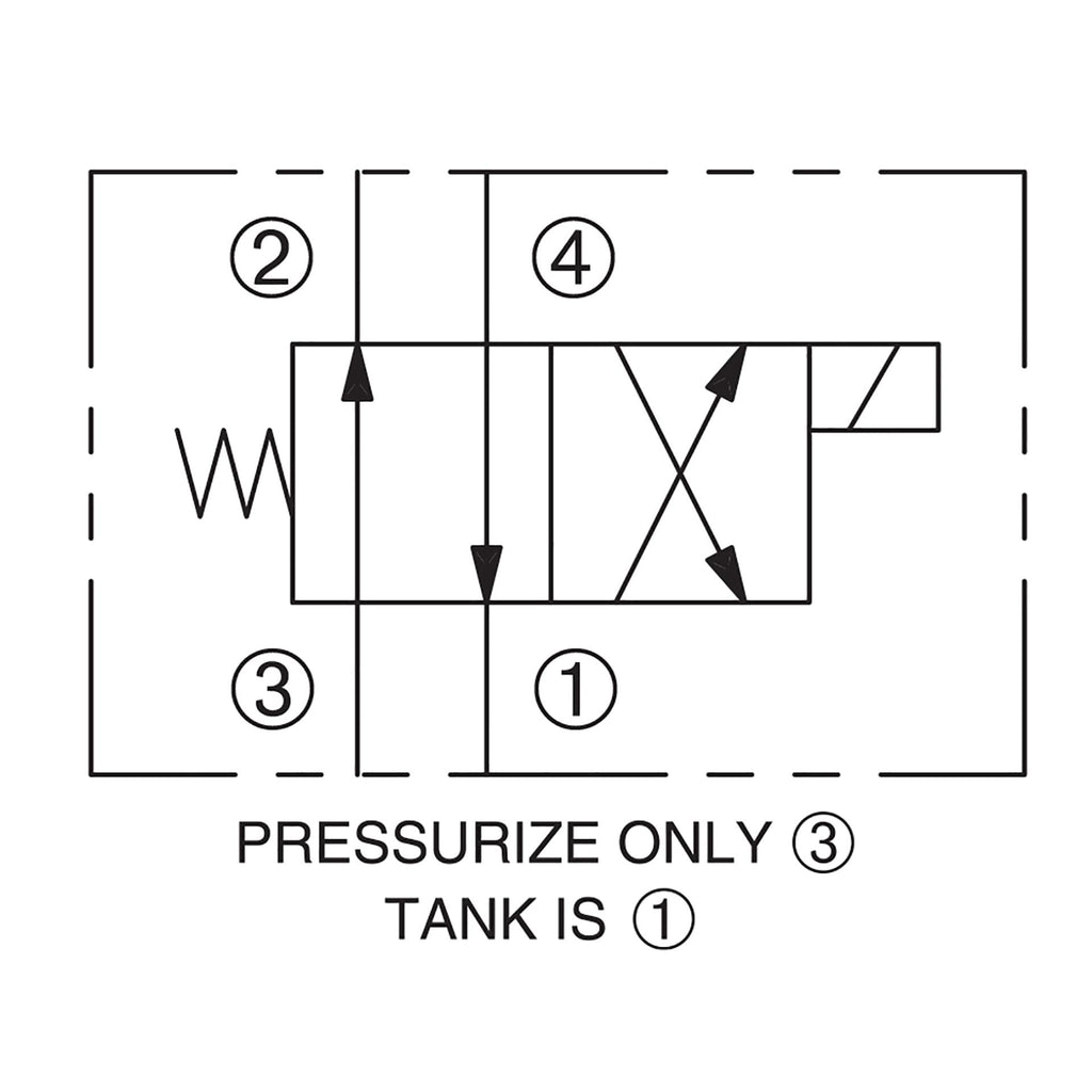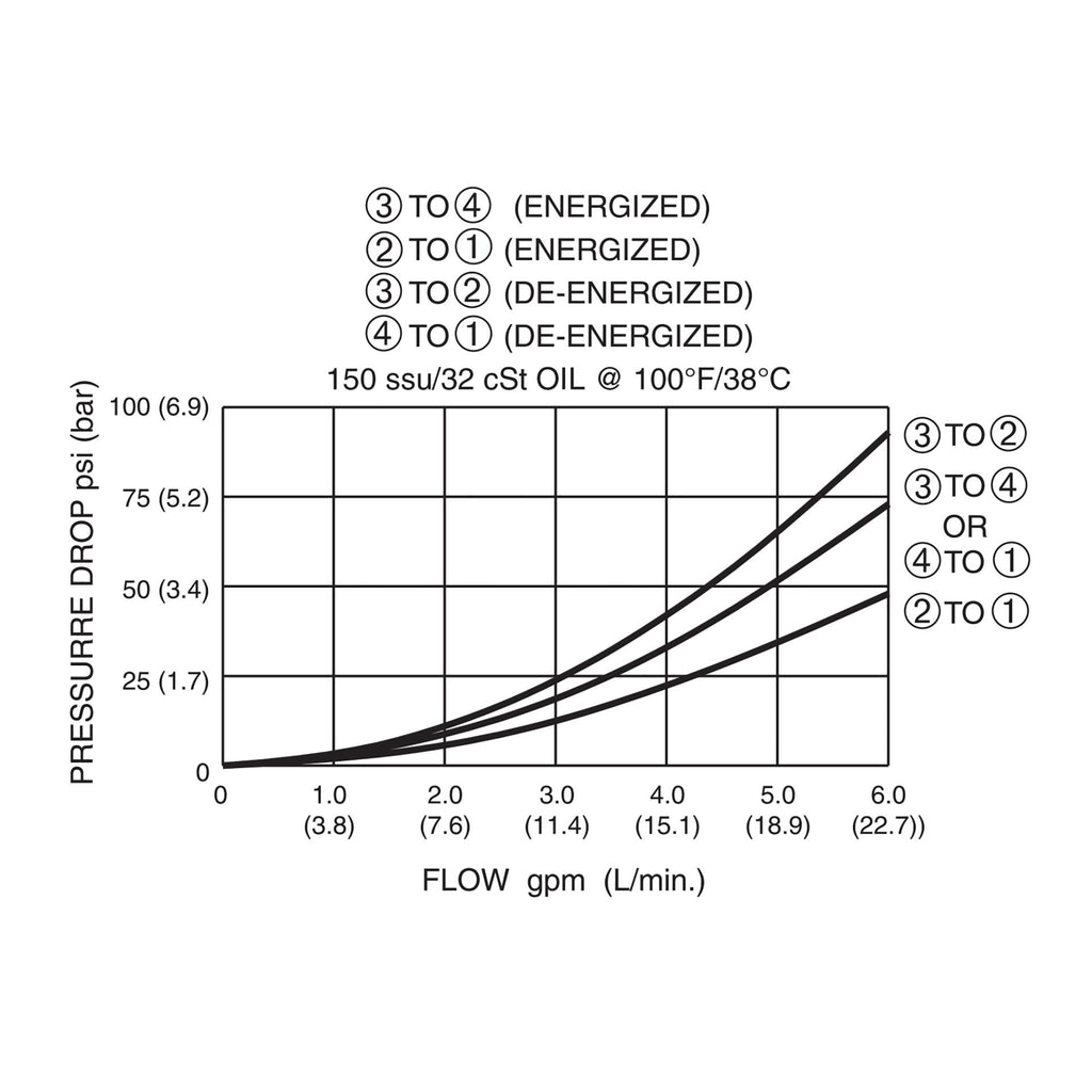The Deltrol Fluid Products DSV2-100-4CO Solenoid Directional Four-Way, Two-Position Crossover Spool Cartridge Valve is a versatile hydraulic valve used for controlling flow in systems with double-acting cylinders or motors. By default, it allows fluid to flow from ports 3 to 2 and from 4 to 1. When energized, it shifts to permit flow between ports 3 and 4 and between 2 and 1. Featuring a robust design for pressures up to 3000 psi and a flow capacity of 6 gpm, this valve includes a manual override for easy operation. Its durable construction and efficient design make it ideal for demanding hydraulic applications.