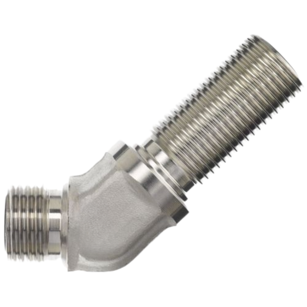 The Series FS2702 45-Degree Angled Male ORFS x Male ORFS Bulkhead adapters, made from durable carbon steel, are designed for fluid power systems that require secure and leak-free connections. These adapters feature SAE J1453 (ORFS) O-ring Face Seal connections, which are widely recognized for their excellent leak control. The male connectors have a straight thread with an O-ring in the face, while the female side has a straight thread and a machined flat face. The O-ring is compressed onto the flat face, creating a tight seal similar to a split flange fitting, ensuring leak prevention. The threads provide a mechanical connection that holds the adapter securely in place. These bulkhead adapters are ideal for high-pressure applications, offering both flexibility and strong sealing performance in various industrial systems.