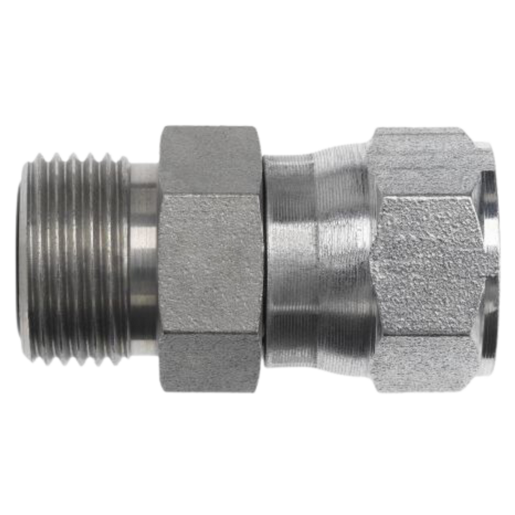 Our Series FS6402 Straight Male ORFS x Female JIC swivel hydraulic adapters provide secure, leak-proof connections for hydraulic systems. ORFS (O-ring Face Seal) fittings feature an O-ring seated in a groove on the face of the fitting, creating an elastomeric seal when compressed between the male fitting and the flat face of the mating component, ensuring a tight, leak-free connection. These adapters are made to SAE J1453 standards and commonly use Buna-N or Viton O-rings, ideal for high-pressure systems. On the other hand, JIC (Joint Industry Council) fittings, with a 37-degree flare seating surface and parallel threads, establish a mechanical seal by mating the male flared fitting with the female coned seat. Together, these components combine the best of both sealing methods, offering reliable and efficient connections for fluid power systems. The swivel design ensures easy installation and flexibility, while the materials used, such as carbon steel, provide strength and durability for demanding applications.