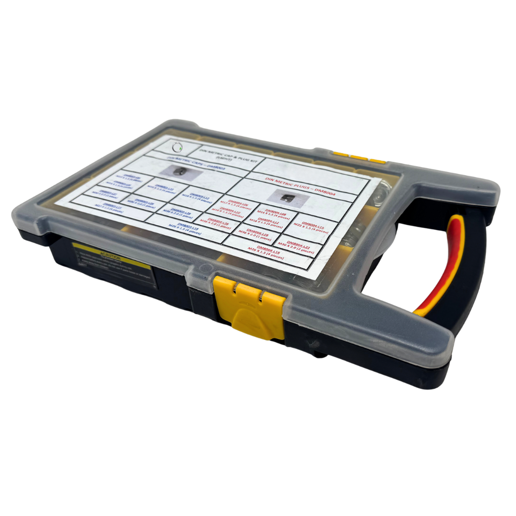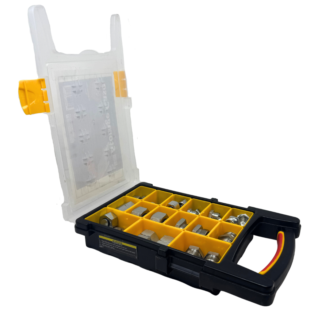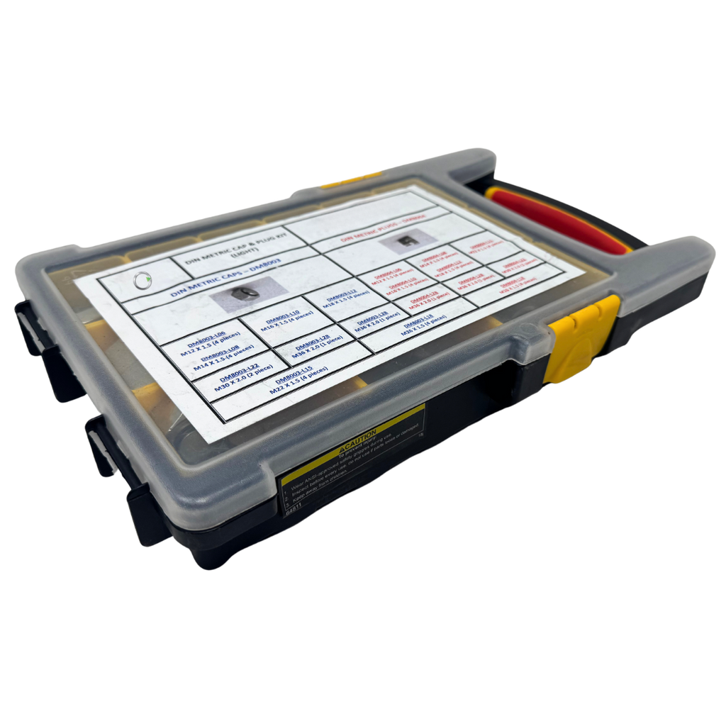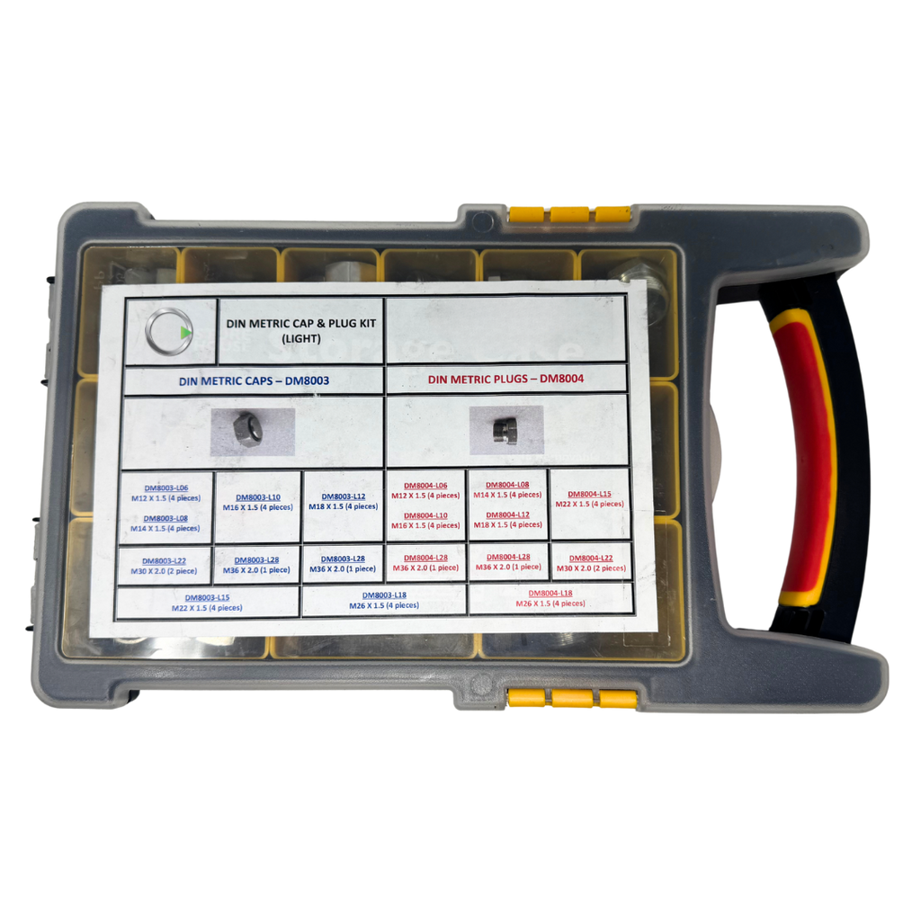 Our OneHydraulics DIN Light Cap & Plug Kit is a convenient, ready-to-use solution for protecting DIN Light metric hydraulic fittings from dirt, dust, and damage during service, storage, or transport. This kit includes DIN Light Metric Caps from our DM8003-L Series and DIN Light Metric Plugs from our DM8004-L Series, covering a full range of sizes from 1/4" to 1". Each precisely machined component ensures a reliable fit to prevent leaks and maintain system cleanliness. Lightweight and portable, this kit is perfect for keeping in your shop or work truck, providing quick and easy access to the right fitting protection whenever you need it.
