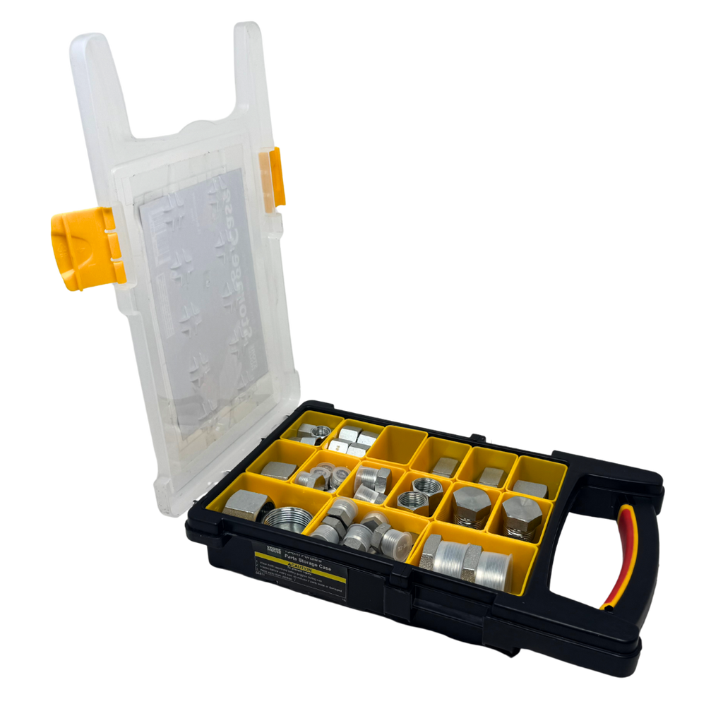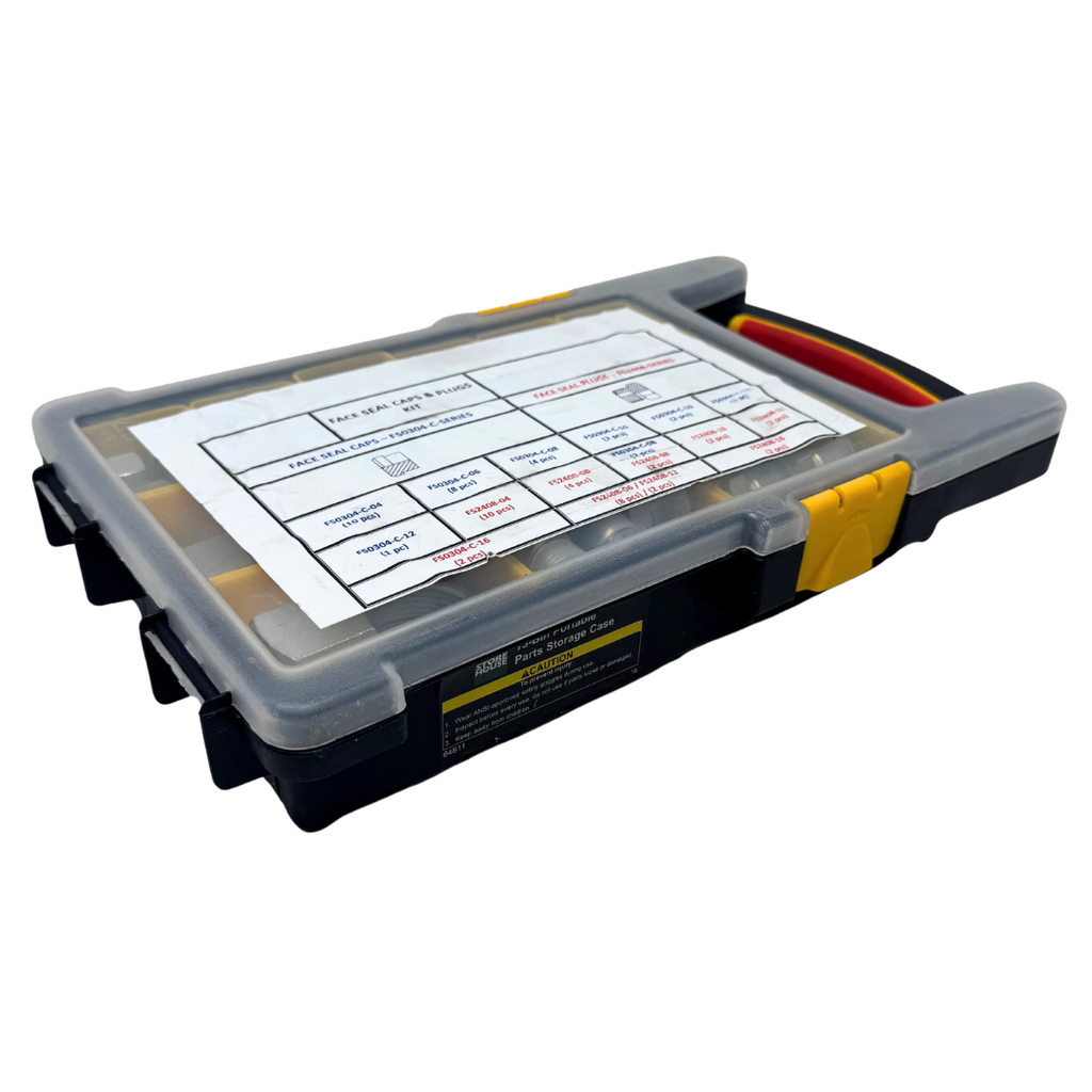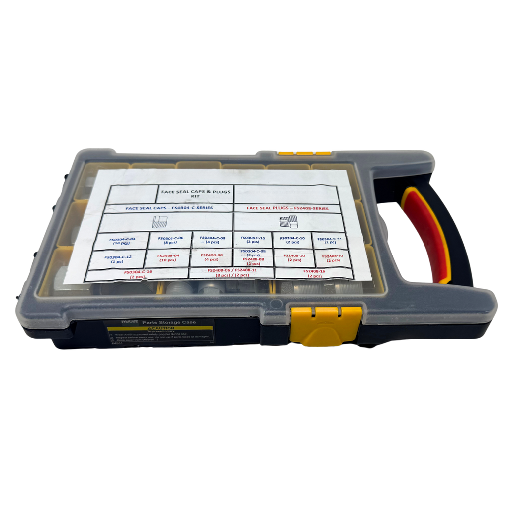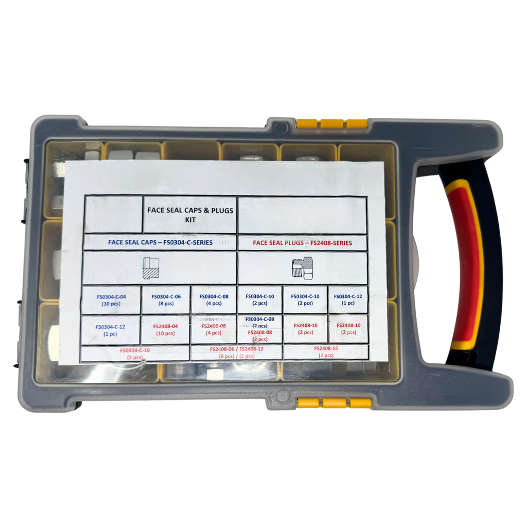 Our OneHydraulics O-Ring Face Seal (ORFS) Cap & Plug Kit is a convenient, all-in-one solution for protecting hydraulic fittings from dirt, moisture, and damage during service, transport, or storage. This kit includes ORFS Caps from our FS0304-C Series and ORFS Plugs from our FS2408 Series, covering a full range of popular sizes from 1/4" to 1". Designed for durability and ease of use, each cap and plug provides a secure, leak-resistant seal to maintain system cleanliness and prevent contamination. Lightweight and portable, this kit is ideal for keeping in your shop or work truck, ensuring you always have the right fitting protection on hand for hydraulic maintenance and repairs.