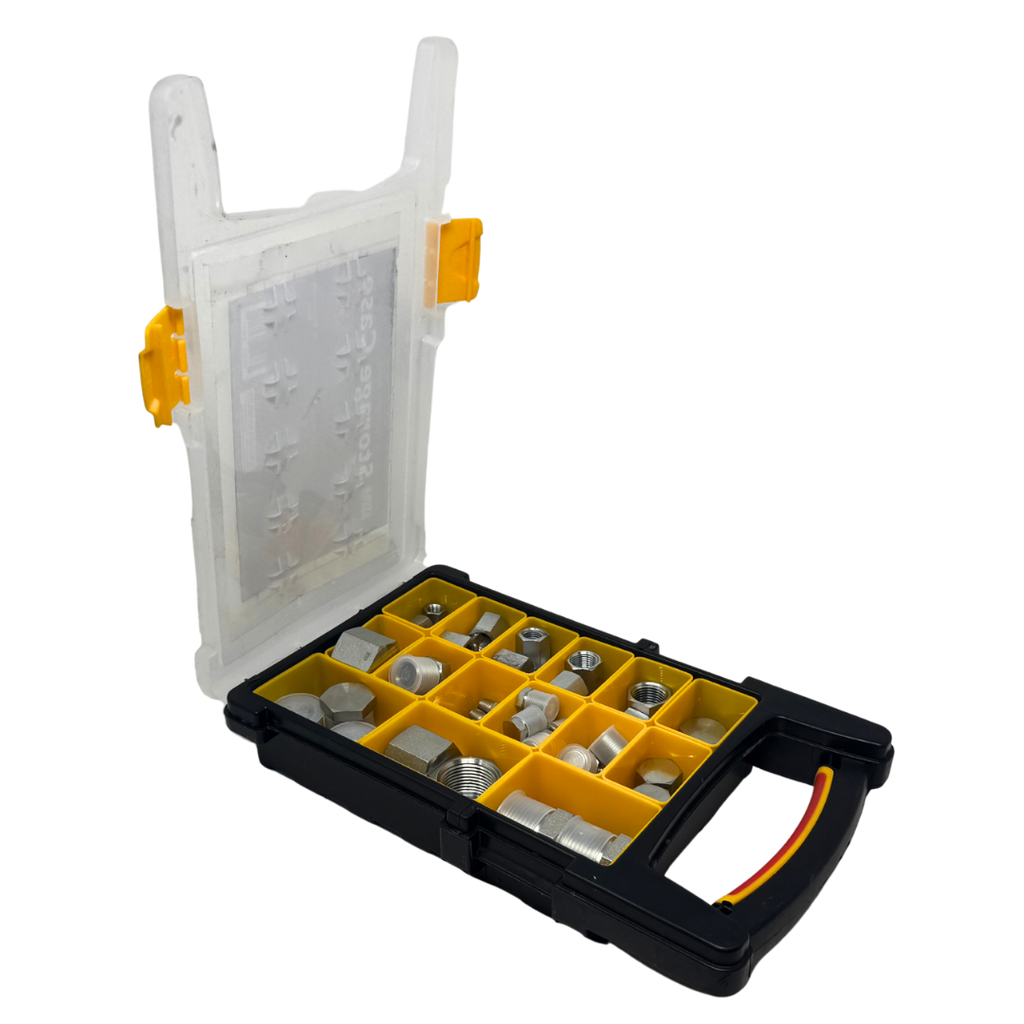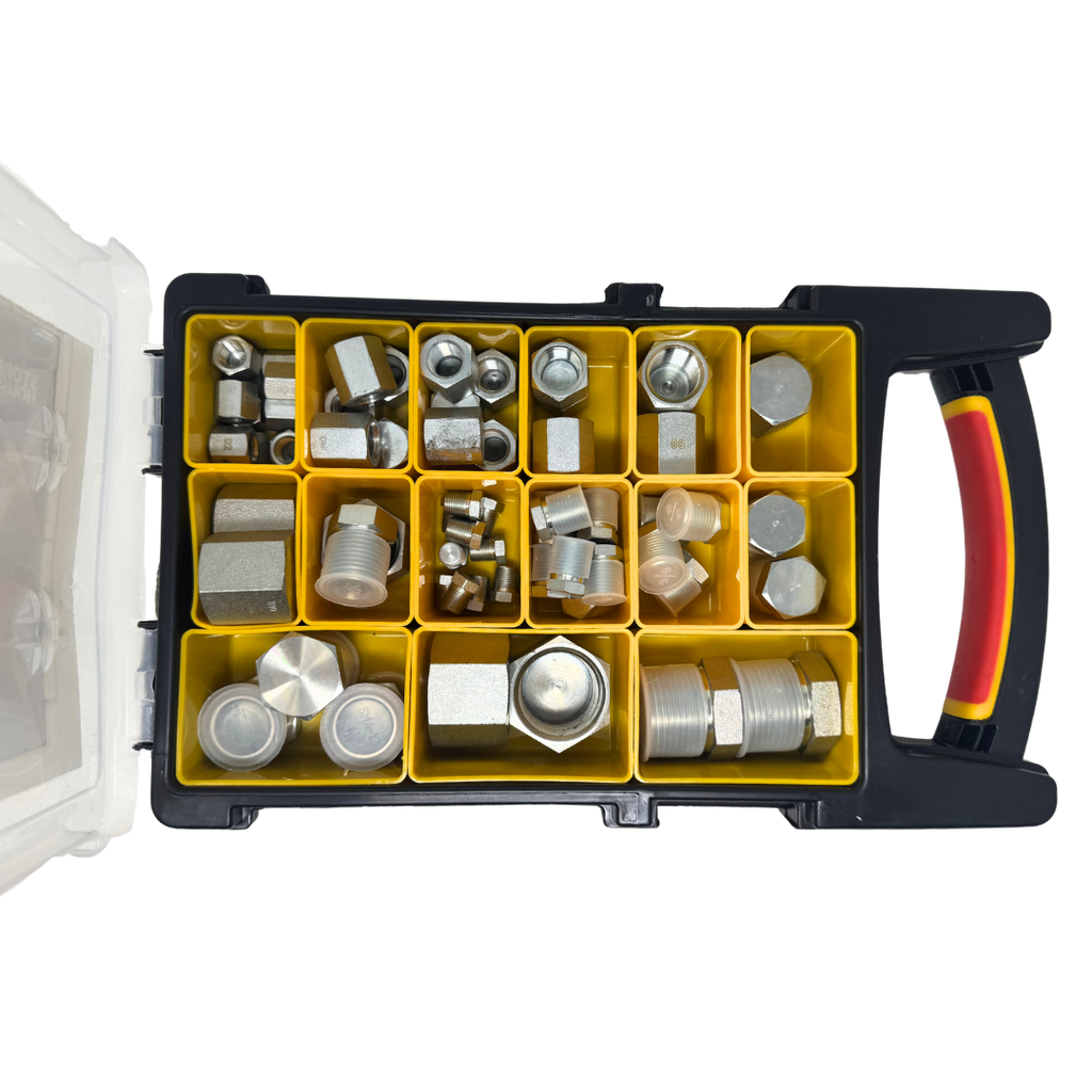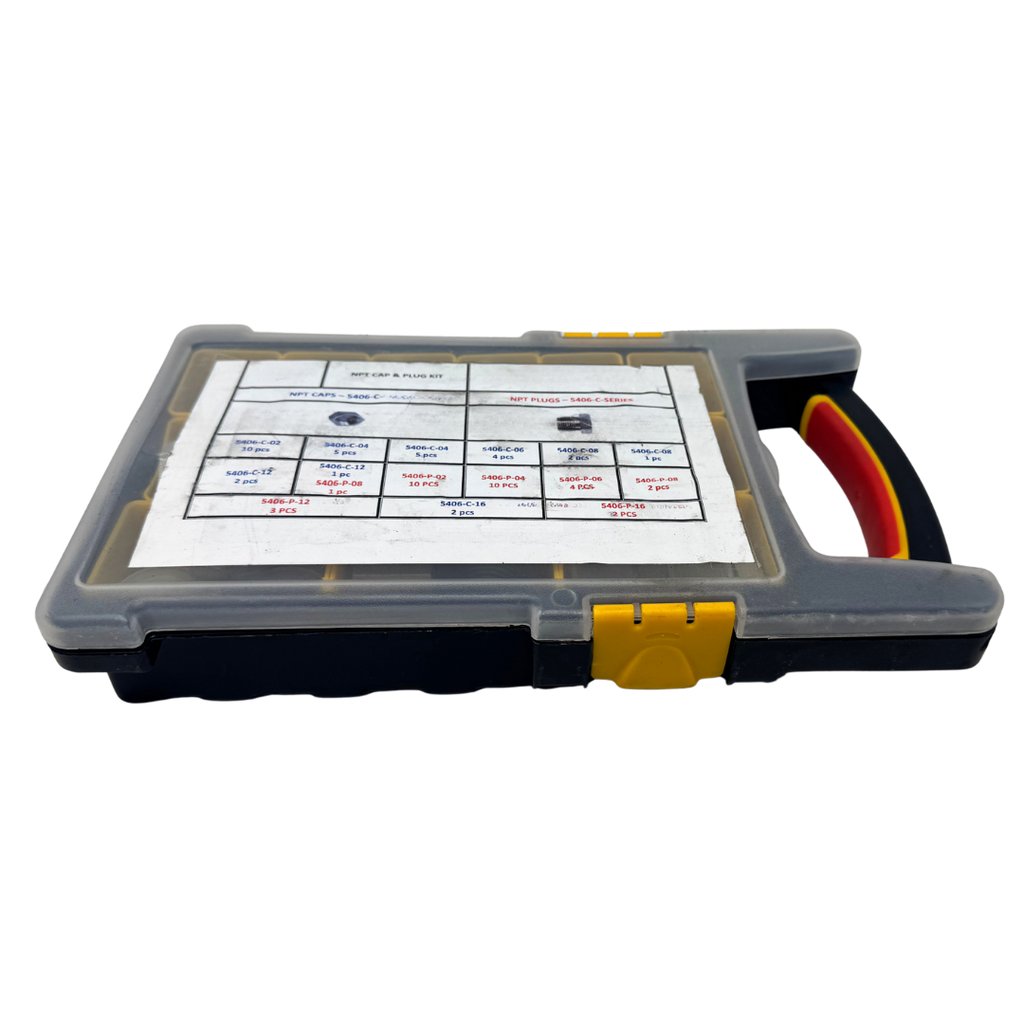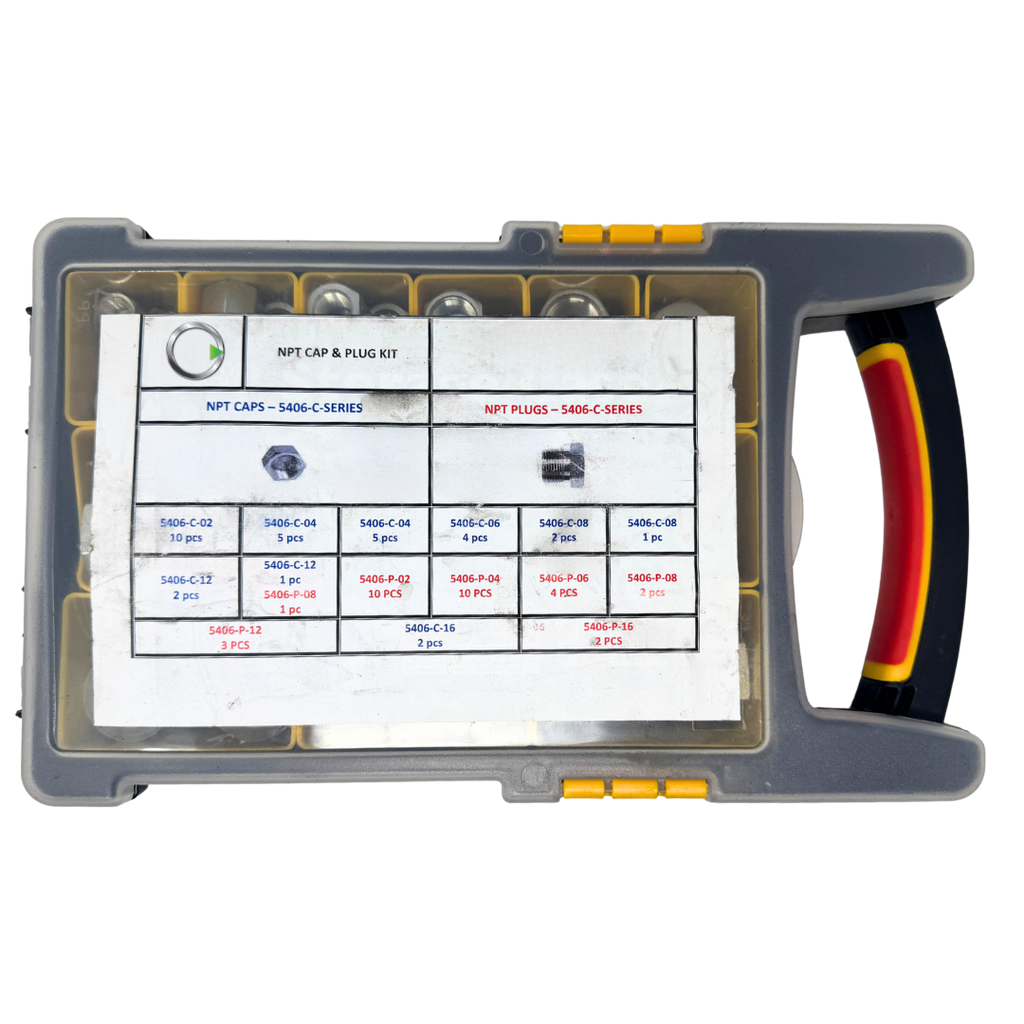 Our OneHydraulics NPT Cap & Plug Kit is a practical, all-in-one solution for sealing and protecting National Pipe Thread (NPT) hydraulic fittings from dirt, debris, and damage during maintenance, storage, or transport. This kit includes NPT Caps from our 5406-C Series and NPT Plugs from our 5406-P Series, covering popular sizes from 1/4" to 1". Each precision-threaded piece ensures a secure, leak-resistant seal to maintain system integrity and prevent contamination. Compact, lightweight, and easy to carry, this kit is ideal for keeping in your shop or work truck, providing quick access to the right fitting protection whenever you need it.