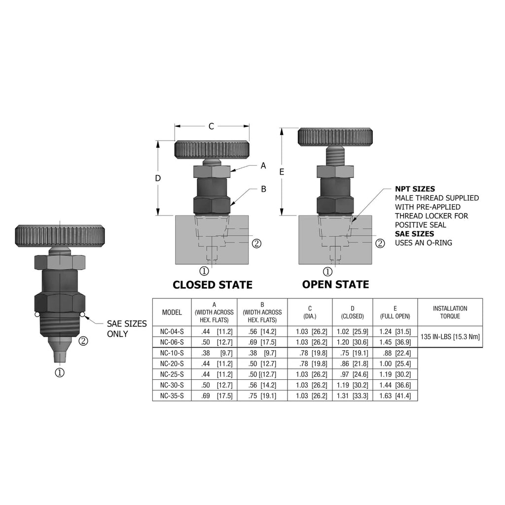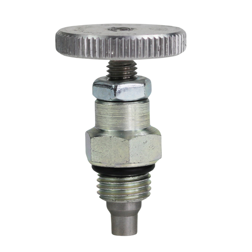 The Deltrol Fluid Products NC-20-S Adjustable Flow Control Needle Valve is a versatile, non-self-contained cartridge valve designed to control flow with precision and offer positive shut-off. Available in sizes from 1/8" to 3/4", it allows for variable flow restriction by adjusting the needle in or out, and fully closes to stop flow when needed. It handles flow rates up to 7.0 gpm and operates at a maximum pressure of 3000 psi. The valve features an aluminum knob for easy adjustment, Viton seals for durability, and can be locked in place. Suitable for temperatures ranging from -15°F to +400°F, it is ideal for mineral-based fluids and ensures reliable performance in various applications.