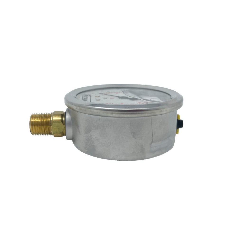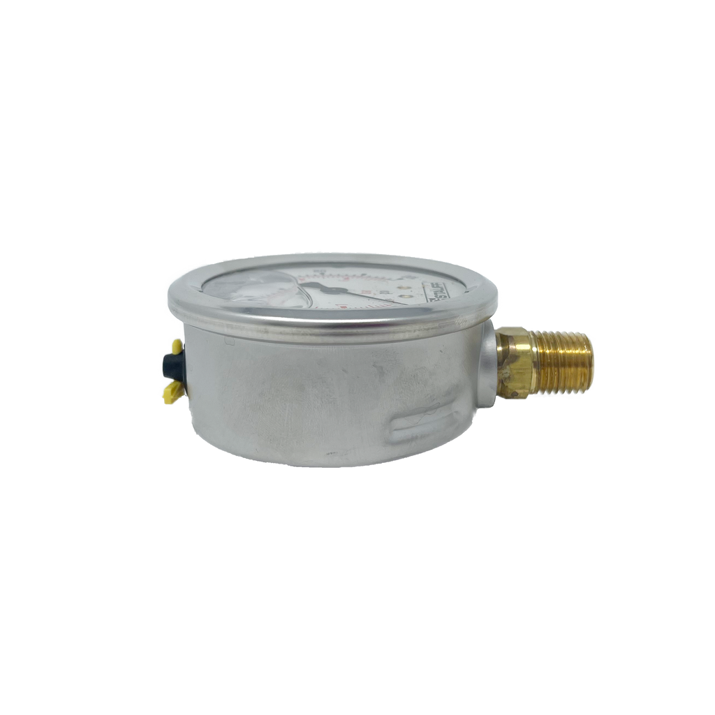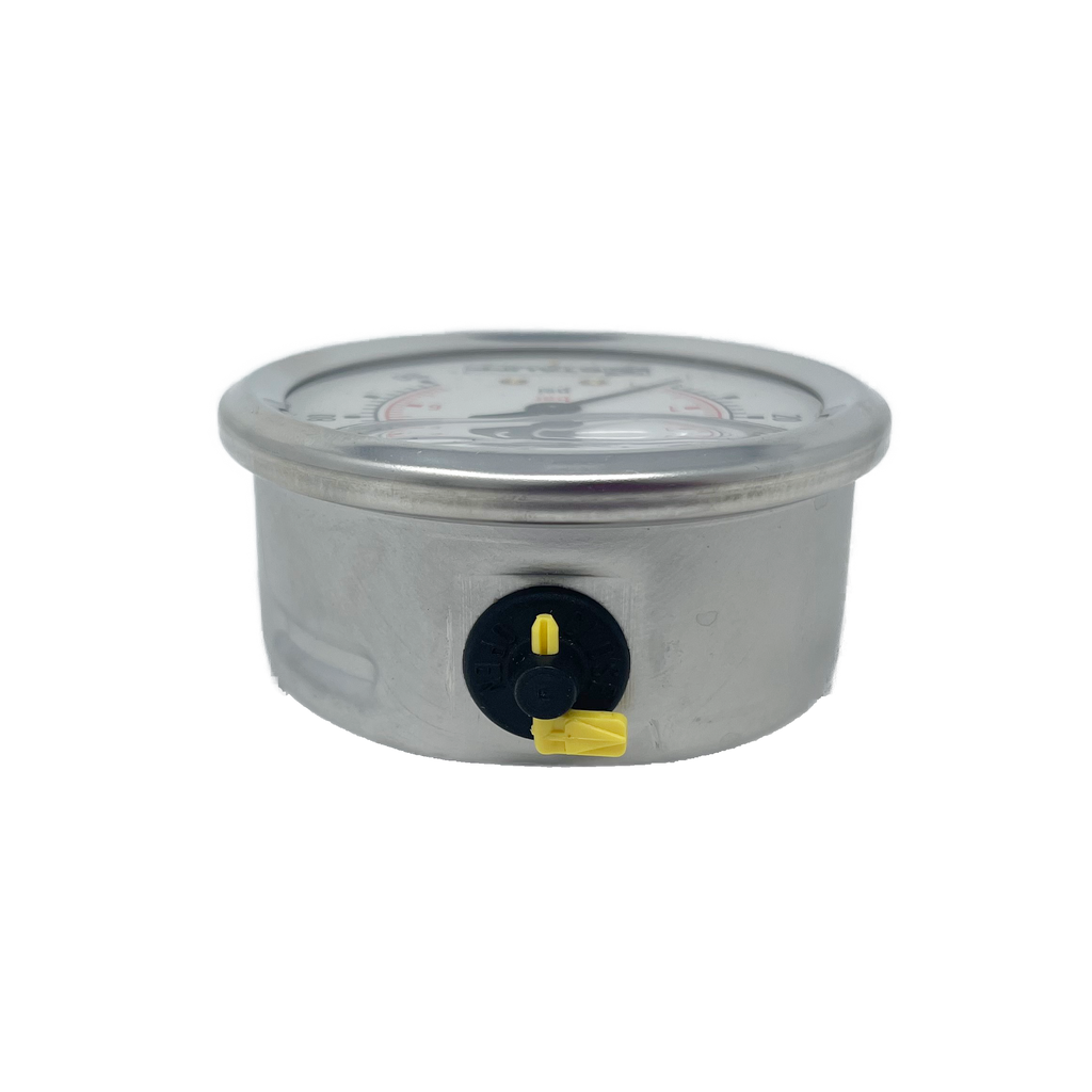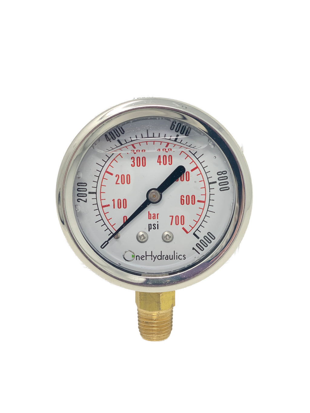 The OneHydraulics OHI-G Series Gauges are Glycerine filled, and feature a 304 Stainless Steel Case and Bezel with phosphor Bronze Bourdon Tube, Bronze Connection, and Polycarbonate Lens. This gauge features a built-in snubber, and the display offers both psi and bar readings with a scale up to 10,000psi. Accuracy is +/- 1.6 percent FSD. Temperature Range is -13 deg F to 180 deg F.