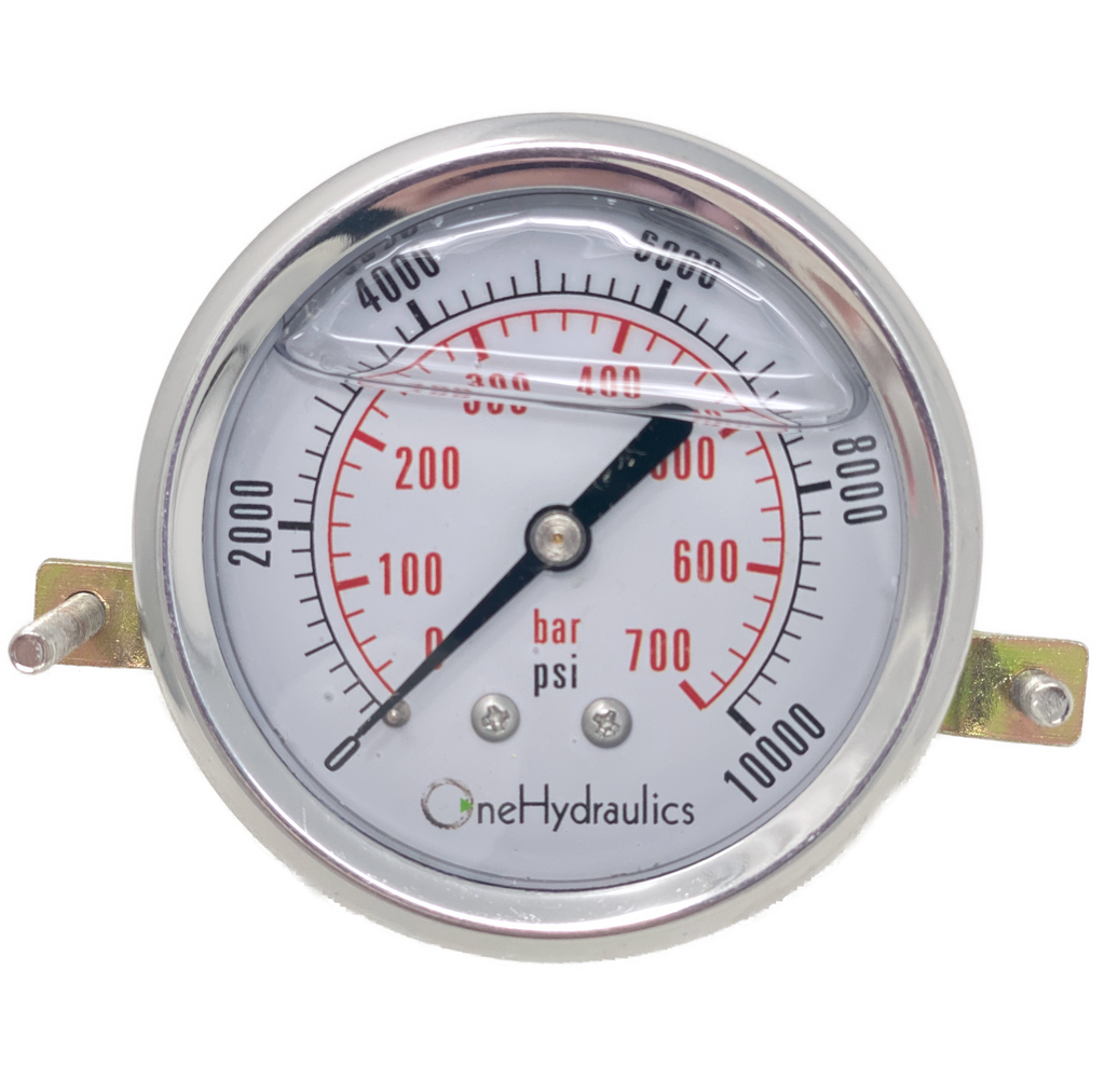 The OneHydraulics OHI-G Series Gauges are Glycerine filled, and feature a 304 Stainless Steel Case and Bezel with phosphor Bronze Bourdon Tube, Bronze Connection, and Polycarbonate Lens. This gauge features a built-in snubber, and the display offers both psi and bar readings with a scale up to 10,000psi. Accuracy is +/- 1.6 percent FSD. Temperature Range is -13 deg F to 180 deg F.