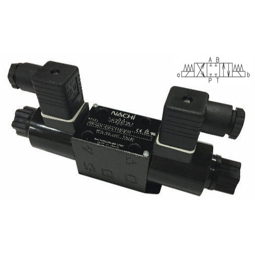 The Nachi SA-G03 is a standard 3-Position, 4-Way, Solenoid Operated Directional Valve. The movable iron core of the wet type solenoid is immersed in oil, which keeps it lubricated and cushions it from impact and vibration, ensuring very long life. The wet-type solenoid valve also provides very low core switching noise for quiet operation.