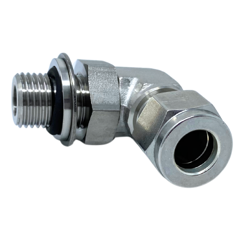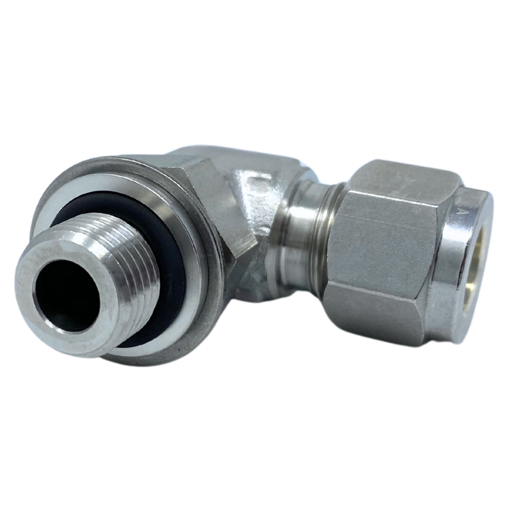 Our Series SPME-U 90-Degree Stainless Female Tube OD x Male ORB Positionable Elbows, made from high-quality 316 stainless steel, are designed to provide flexible, secure connections in hydraulic and fluid power systems. These elbows feature a 90-degree angle for efficient directional changes in tubing, while the female tube OD (Outside Diameter) end connects seamlessly to tubing, and the male ORB (O-Ring Boss) end ensures a leak-tight seal through the use of an O-ring. The positionable design allows for easy adjustment of the connection, providing versatility in tight or complex system layouts. These fittings are ideal for high-pressure applications in industries such as oil & gas, chemical processing, and manufacturing, offering both durability and long-lasting reliability.