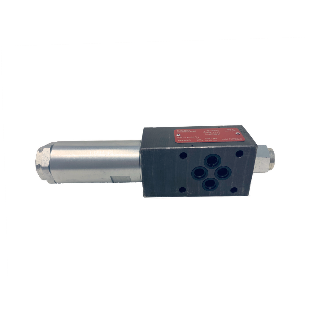 The Argo-Hytos VRP2-06 is a direct-acting, pressure reducing-relieving modular D03 valve. The VRP2 pressure valves designed for vertical stacking assemblies designed as 3-Way Valves, which means it includes pressure protection of the secondary circuit. This valve consists of the valve body, control spool, spring, and adjustment element. The body includes an M port for attachment of a pressure measuring device or a bypass free flow check valve. All spool model functional descriptions can be found on the catalog page for this valve. In model P, the pressure reduction occurs from port P2 to port P1, and is effective in both flow directions through the directional valve. Therefore, the protection of the secondary circuit is ensured for both flow directions.