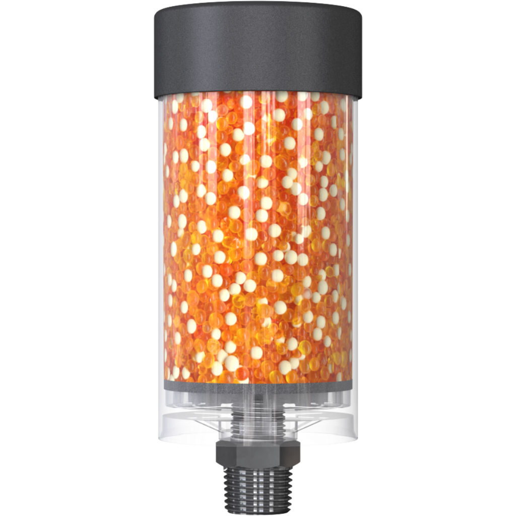 The Series VV-D Desiccant Breather Dryer is a disposable moisture control solution designed for hydraulic systems, gears, drums, IBCs, and mobile machinery in indoor, outdoor, and offshore environments. Its durable plastic housing contains GIEBEL Xdry® desiccant and features a 3μm filter for effective air drying and cleaning. The breather ensures constant air exchange, removing water molecules and dirt particles, while an activated carbon layer adsorbs oil mist to protect both the desiccant and the environment. The granulate's optimal 2-5mm grain size guarantees excellent drying efficiency with minimal pressure build-up, achieving a residual humidity of 2% rH and a dew point of -40°C. A two-stage slosh protection system ensures oil contamination is prevented. The VV-D series is designed to be disposable, with no replacement cartridges—once the GIEBEL Xdry® desiccant reaches full saturation and the silica gel grains turn green, the entire absorber is replaced, ensuring reliable, low-maintenance protection against moisture damage.